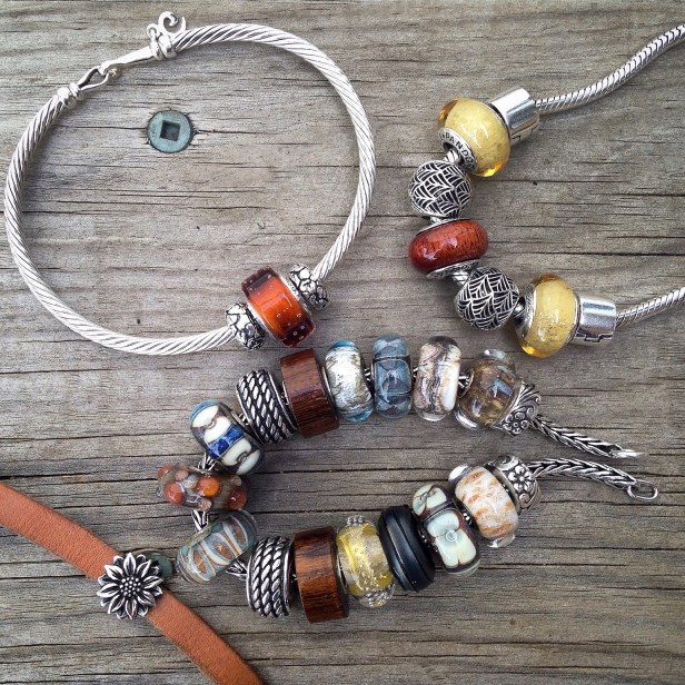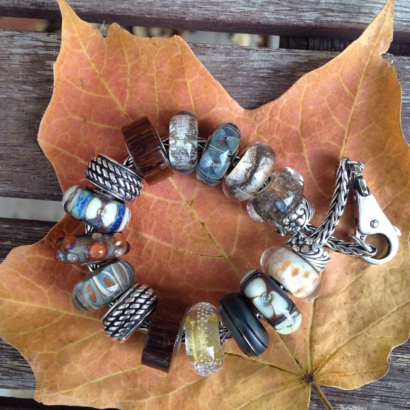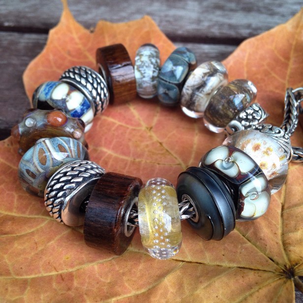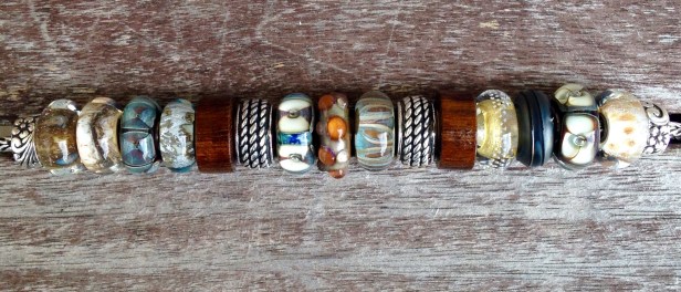 Here is a mostly Trollbeads glass bracelet with the addition of Ohm Beads’ Bolly wood beads and Redbalifrog’s silver Rope beads.