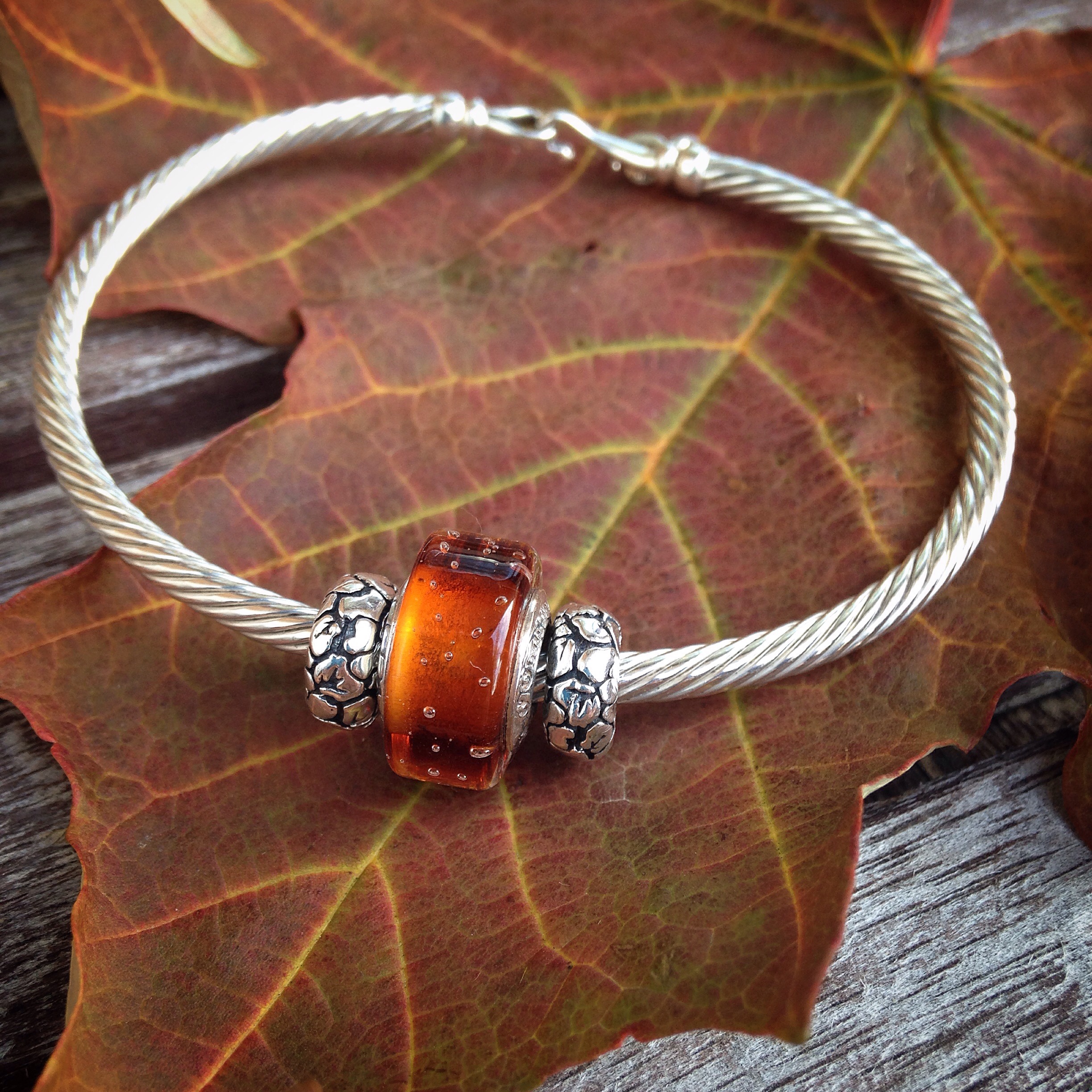 This is Ohm Beads’ Twisted Silver Bangle, Earthish stoppers and Bar Brawl glass bead. The bangle is super comfortable due to its oval shape.