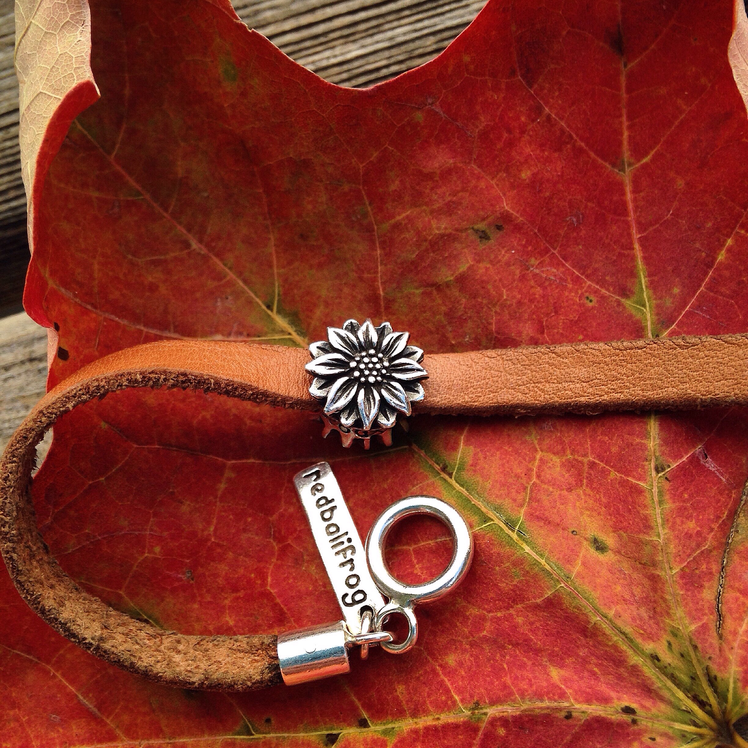 Here is Redbalifrog’s Leather Strap bracelet with the Sunflower bead.