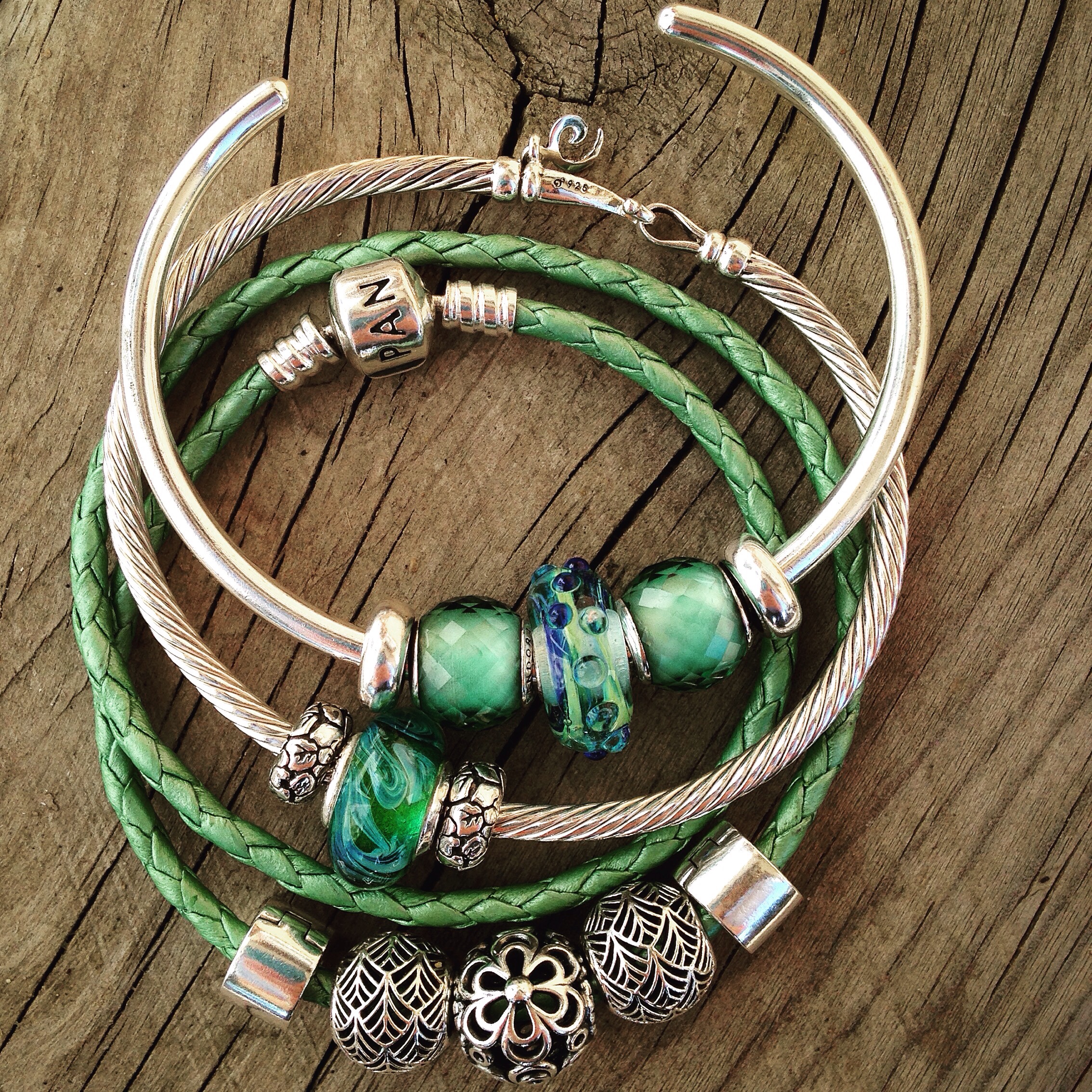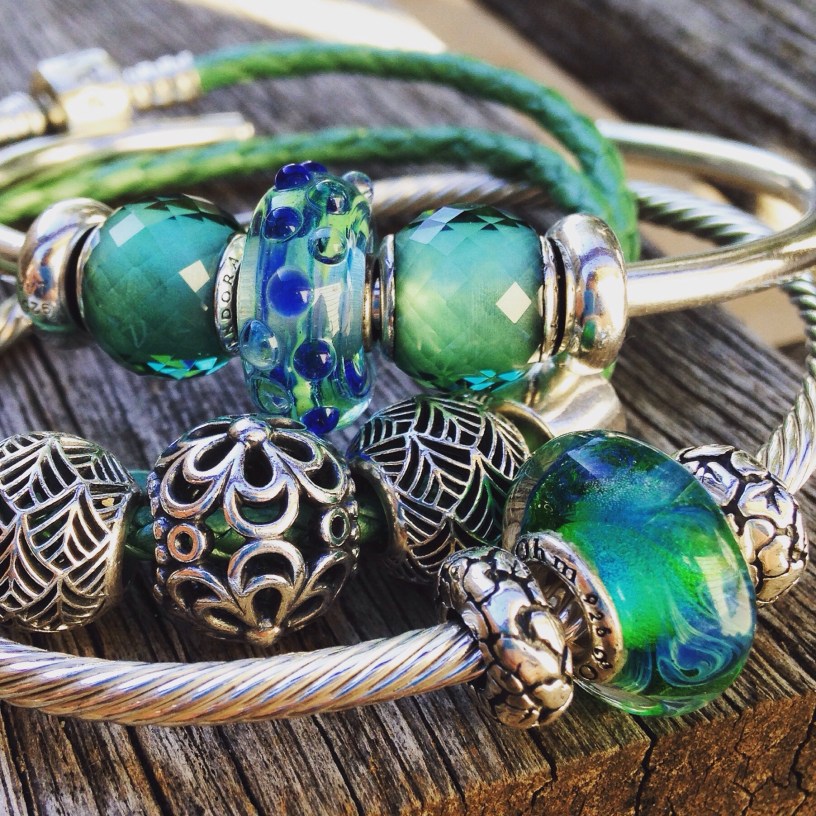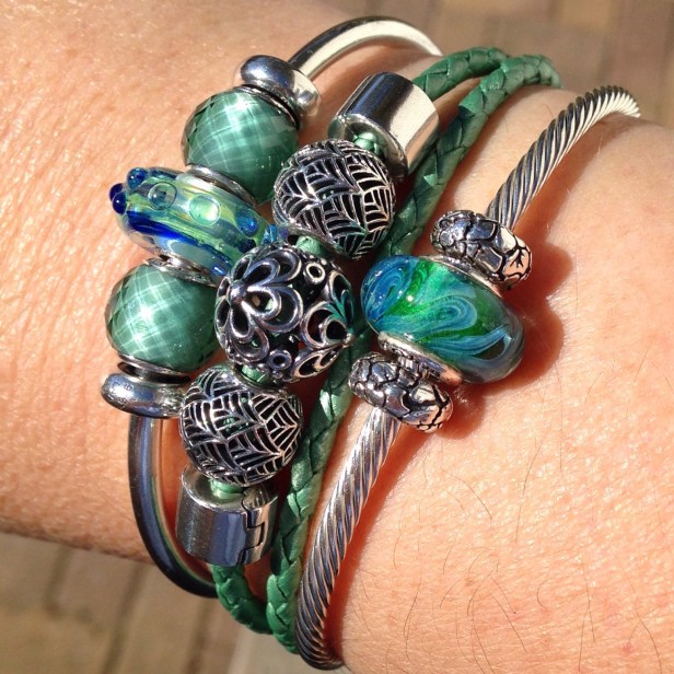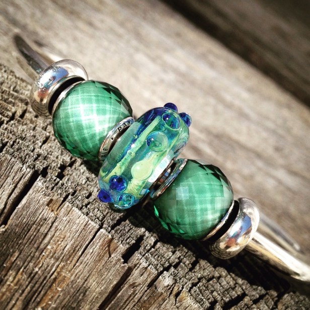 Here are the Pandora Green Petite Facets with the Trollbeads Whitecap bead.