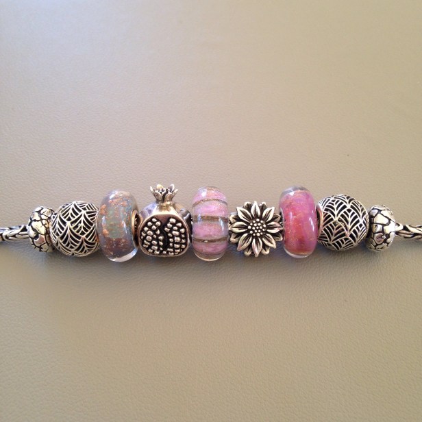 For another bracelet to go with this combo, I’ve put the Ohm Beads Earth-ish Stoppers on the Redbalifrog bracelet. The two silver beads at either end are Pandora’s Tropicana beads and the glass beads are all by Trollbeads. In the middle are the Pomegranate and Sunflower by Redbalifrog.