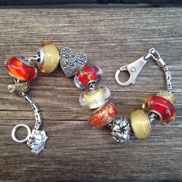 Bracelet, stoppers, silver beads are by Redbalifrog.