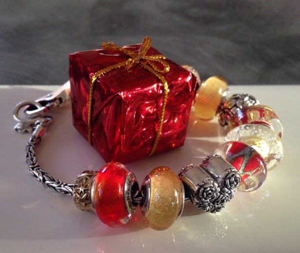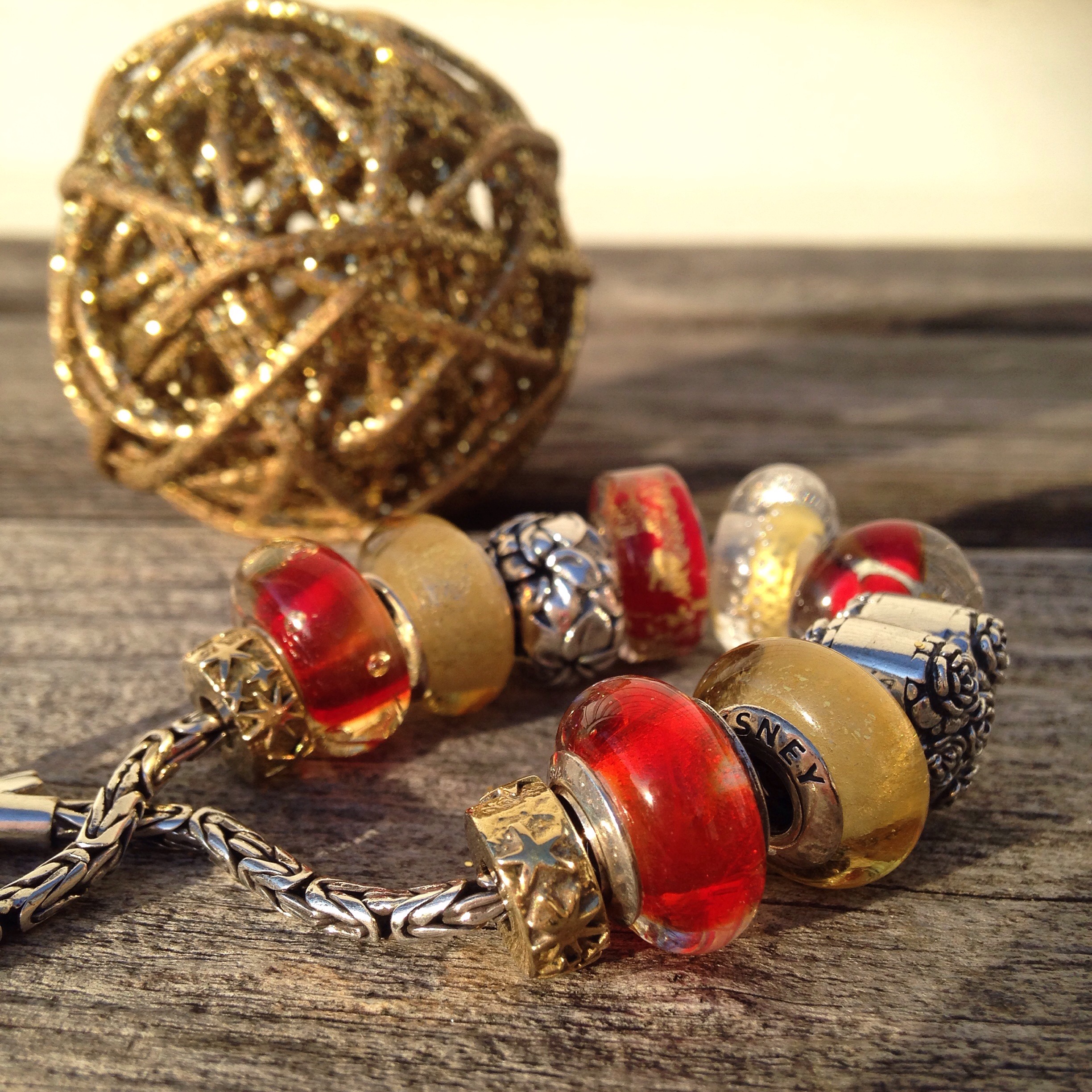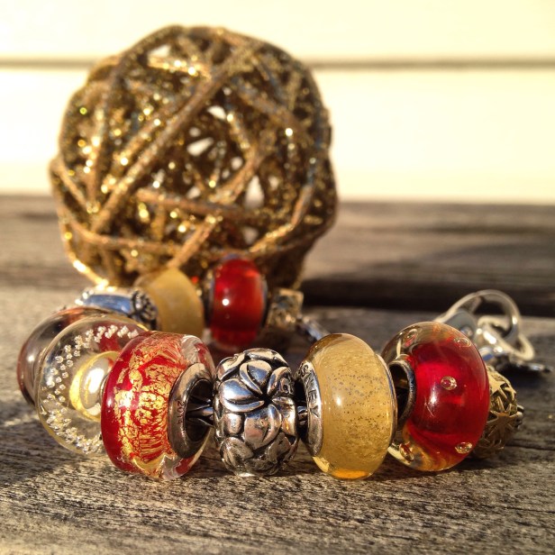 On my quest to make a different Christmas type bracelet I stumbled upon this combo. The Redbalifrog brass stoppers are perfect for a red and gold colour scheme.