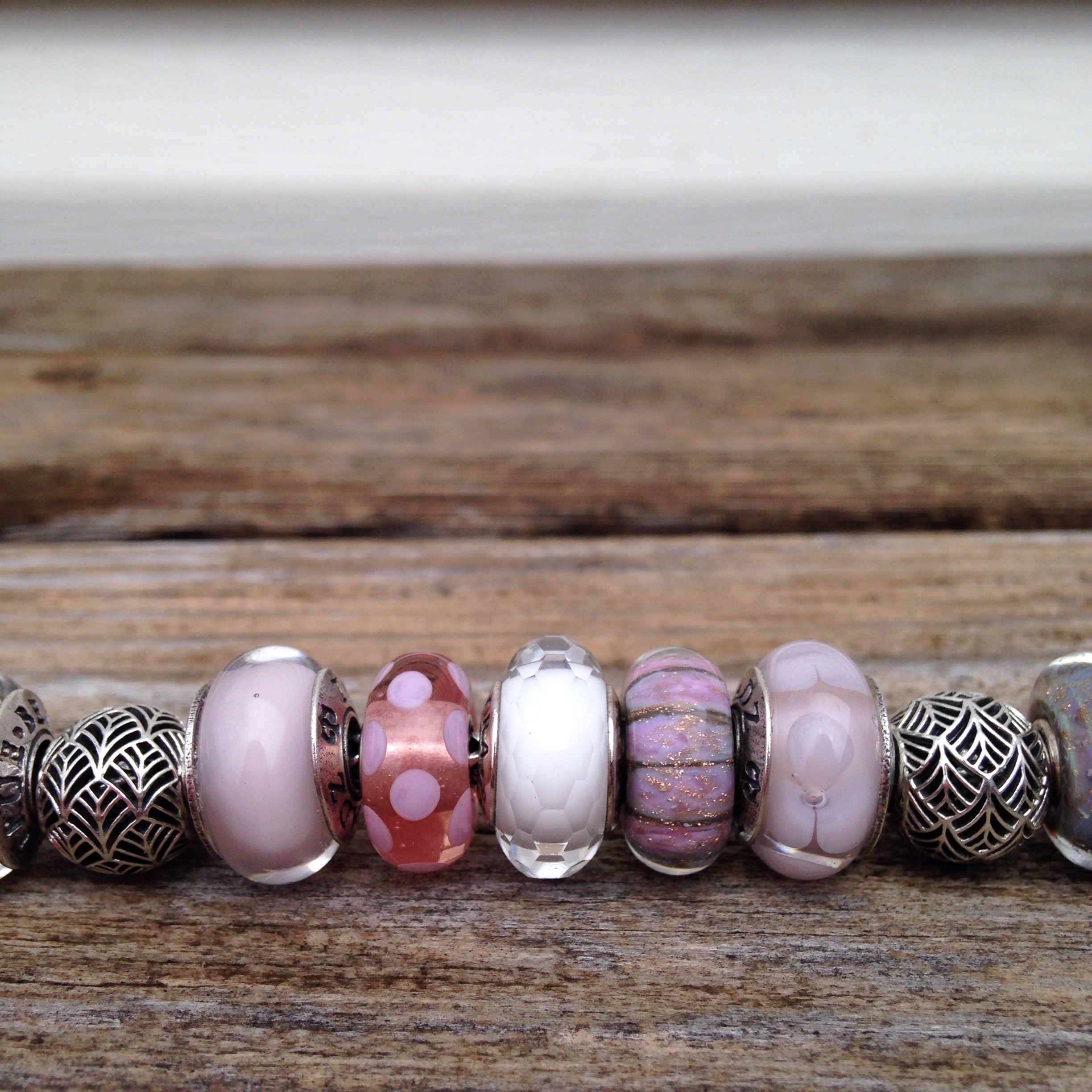 In the middle of the bracelet are more pinks with the white Pandora faceted one.