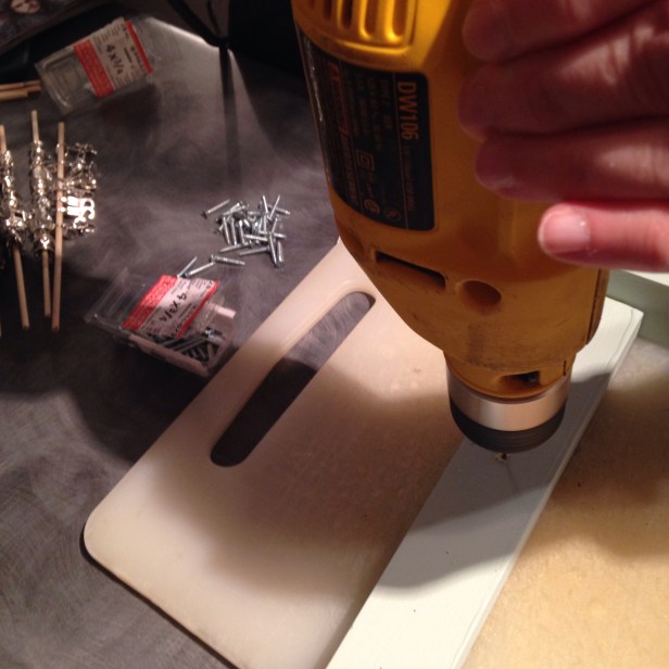 After painting we (and by we I mean mostly my husband) nailed the side pieces to the base. Next we drilled pilot holes in the wood, then put in the screws using a screw driver attachment on the drill.