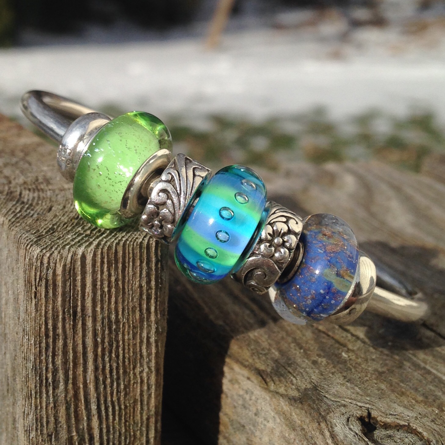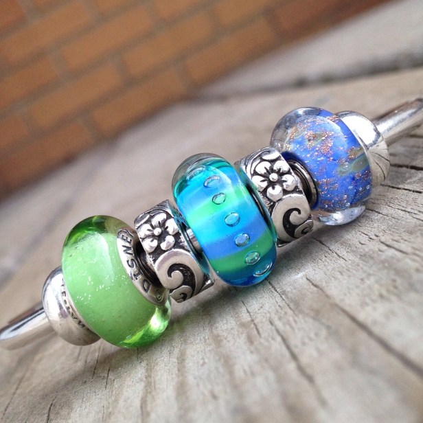 Next I tried the green Murano with some Redbalifrog Hawaiian Floral stoppers and some Trollbeads. I like it, but it is a bit off balance regarding the core sizes.