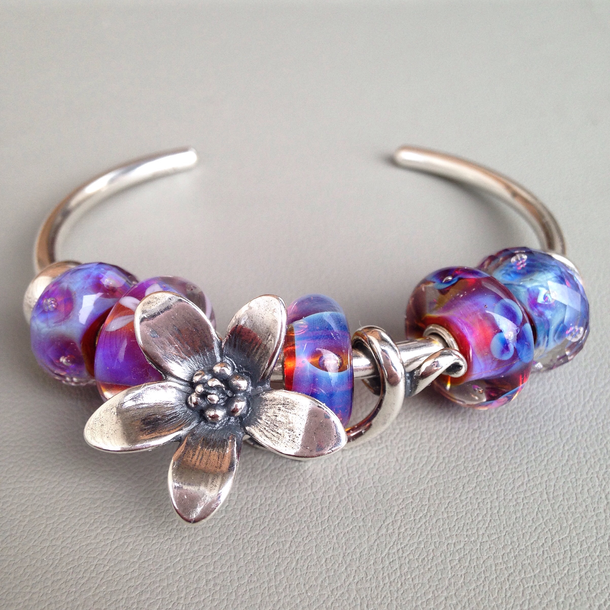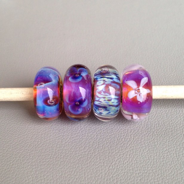 The Aurora beads that Trollbeads makes are a favourite of mine. The first one I got when it came out as part of a set with the bangle. That’s just when I was starting to collect beads, so it worked out well. It’s the one on the left. I love how there are shades of purple and blue and even yellowish/gold, depending on the light. Next to it is the Aurora Flower, then Moonlight Bubbles and Sea Anemone.
