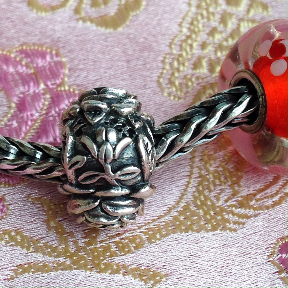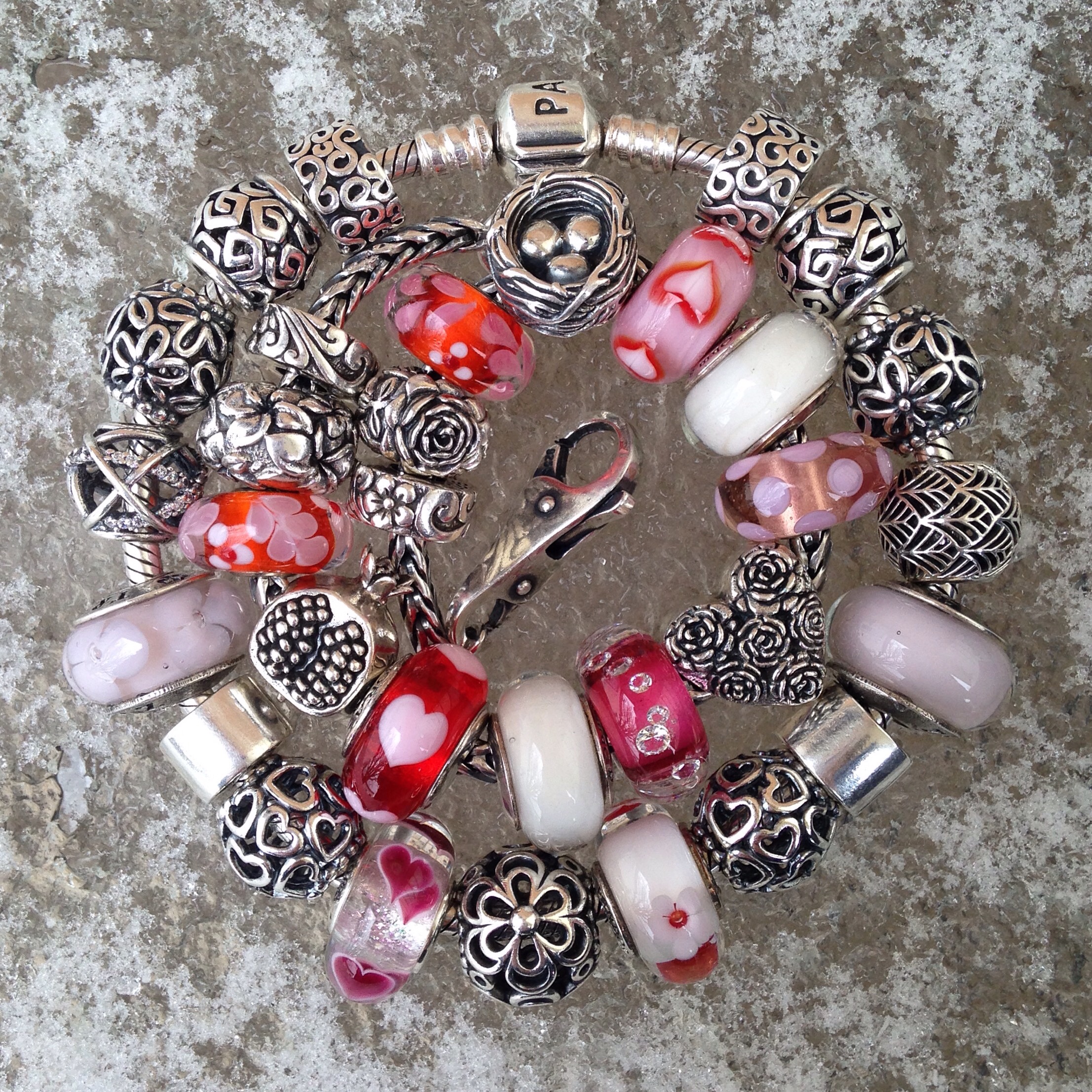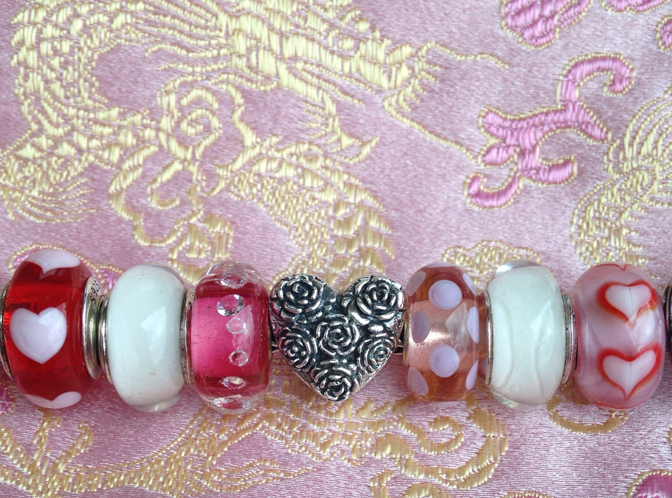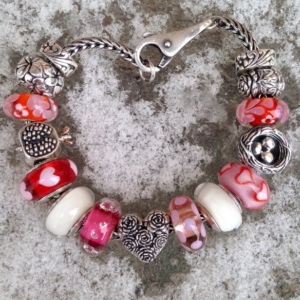 I knew I wanted to make a bracelet using my Asian Hearts Trollbead (bottom right), but I didn’t want to take apart the Pandora bracelet from a couple of days ago, so I started from scratch. I pretty much always build a bracelet from the middle out, so I started with the Redbalifrog Heart of Roses and added some glass beads.