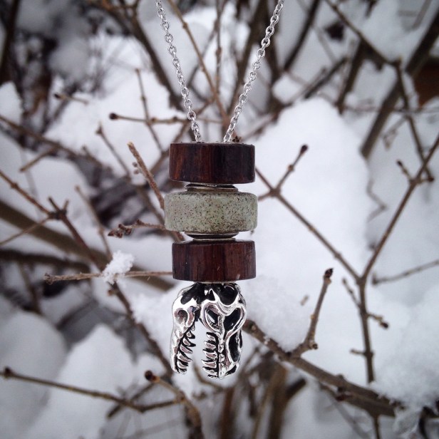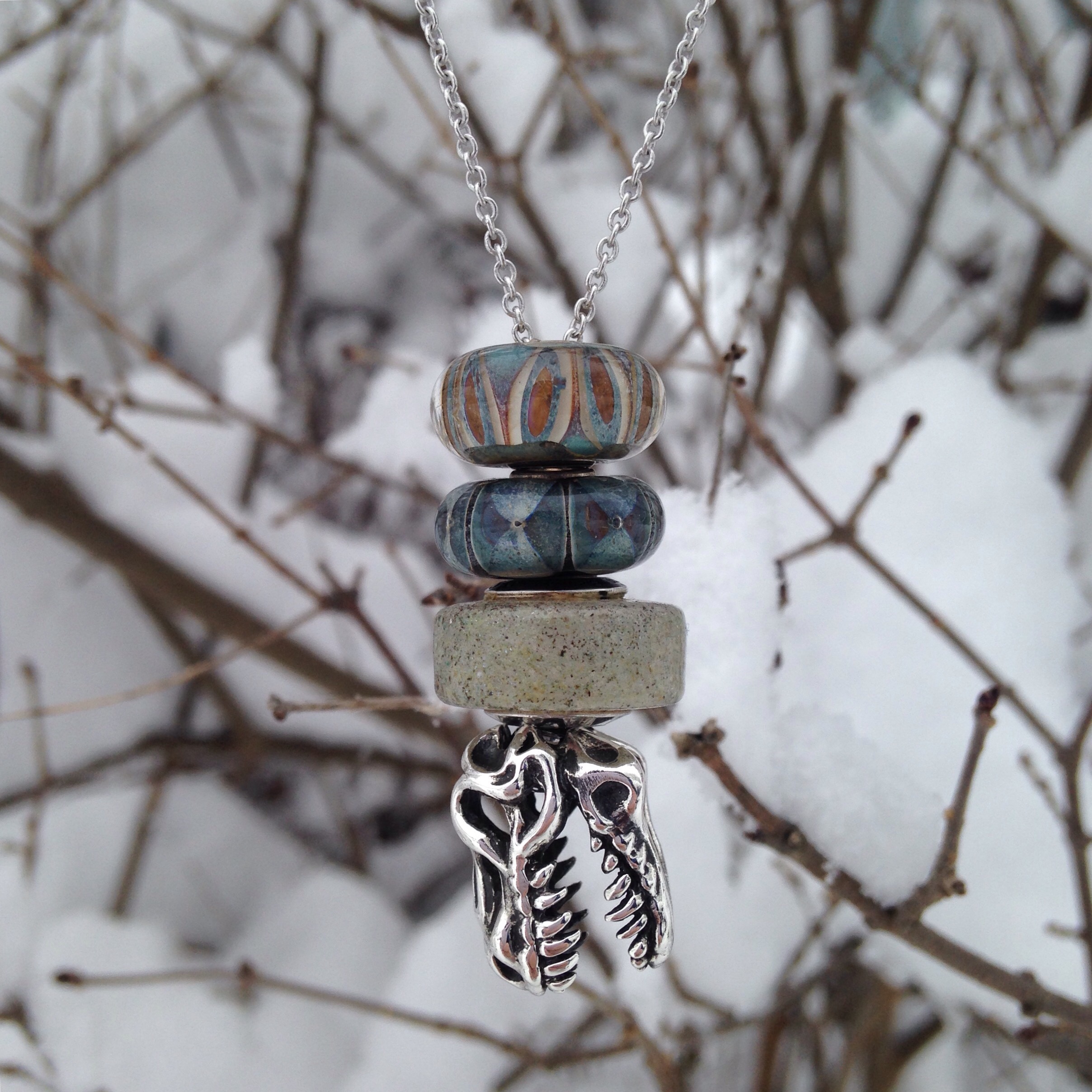 I think the students at the school where I’m going today will really like this T-Rex skull. I know I’m enjoying wearing it! All beads (except the two Trolls on the necklace) are Ohm Beads. Are there any other dinosaur skull fans out there? 😀