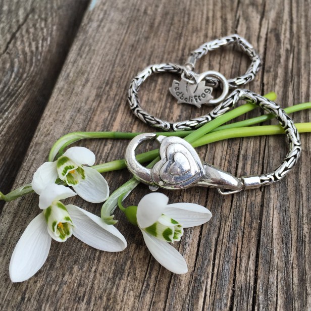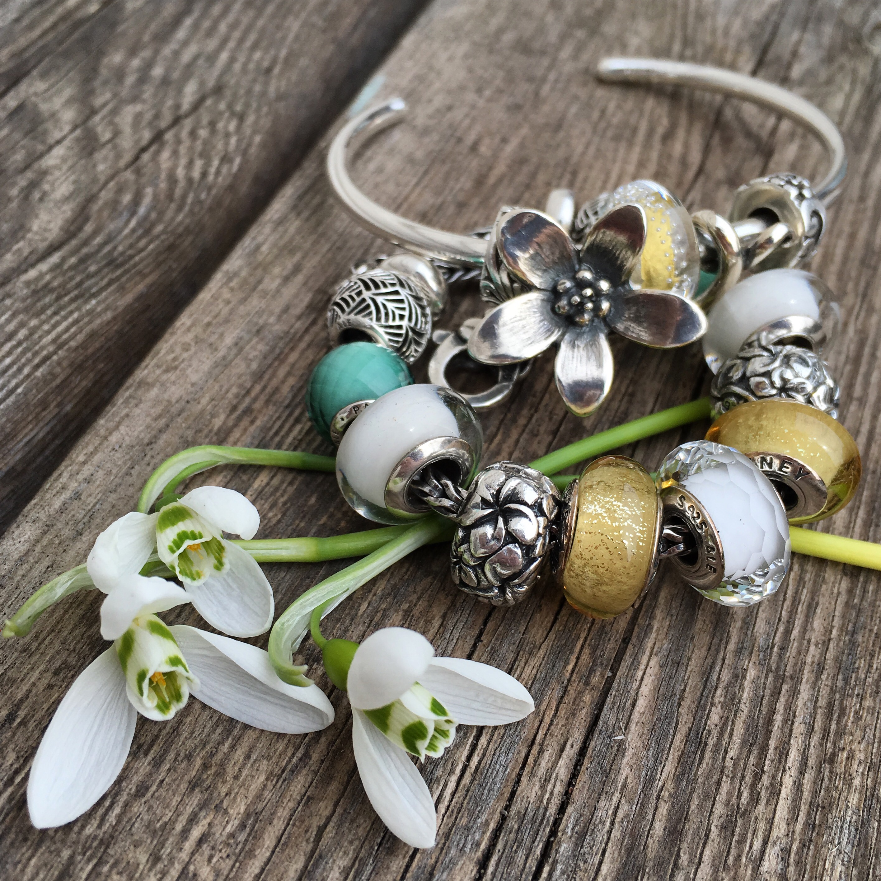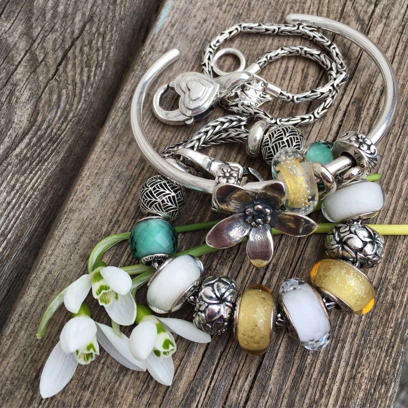 After I came home from work it was so pleasant and warm that I went into the backyard. Lo and behold all the snow had melted and I could see some snowdrops! First I tried one snowdrop with a Trollbeads bangle.