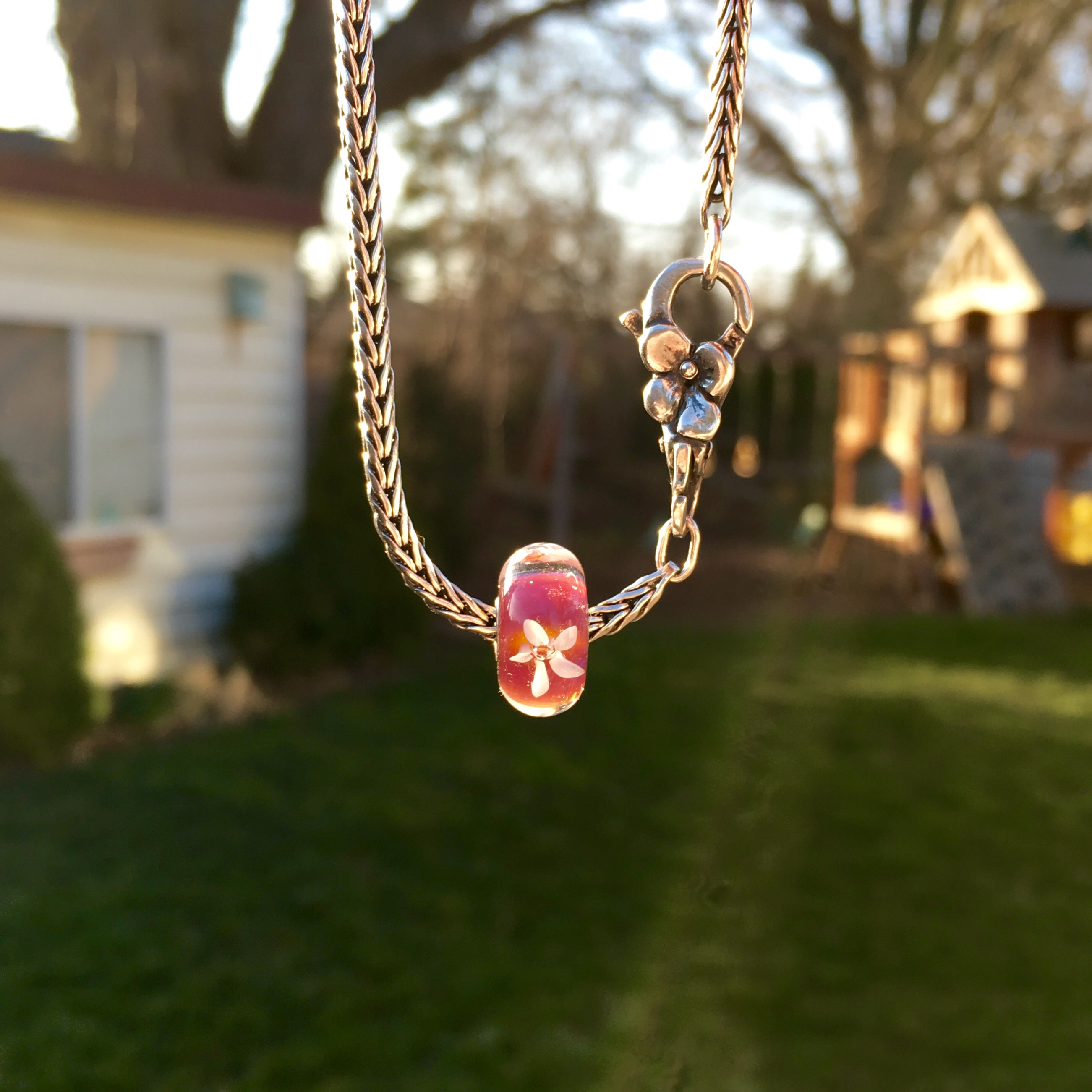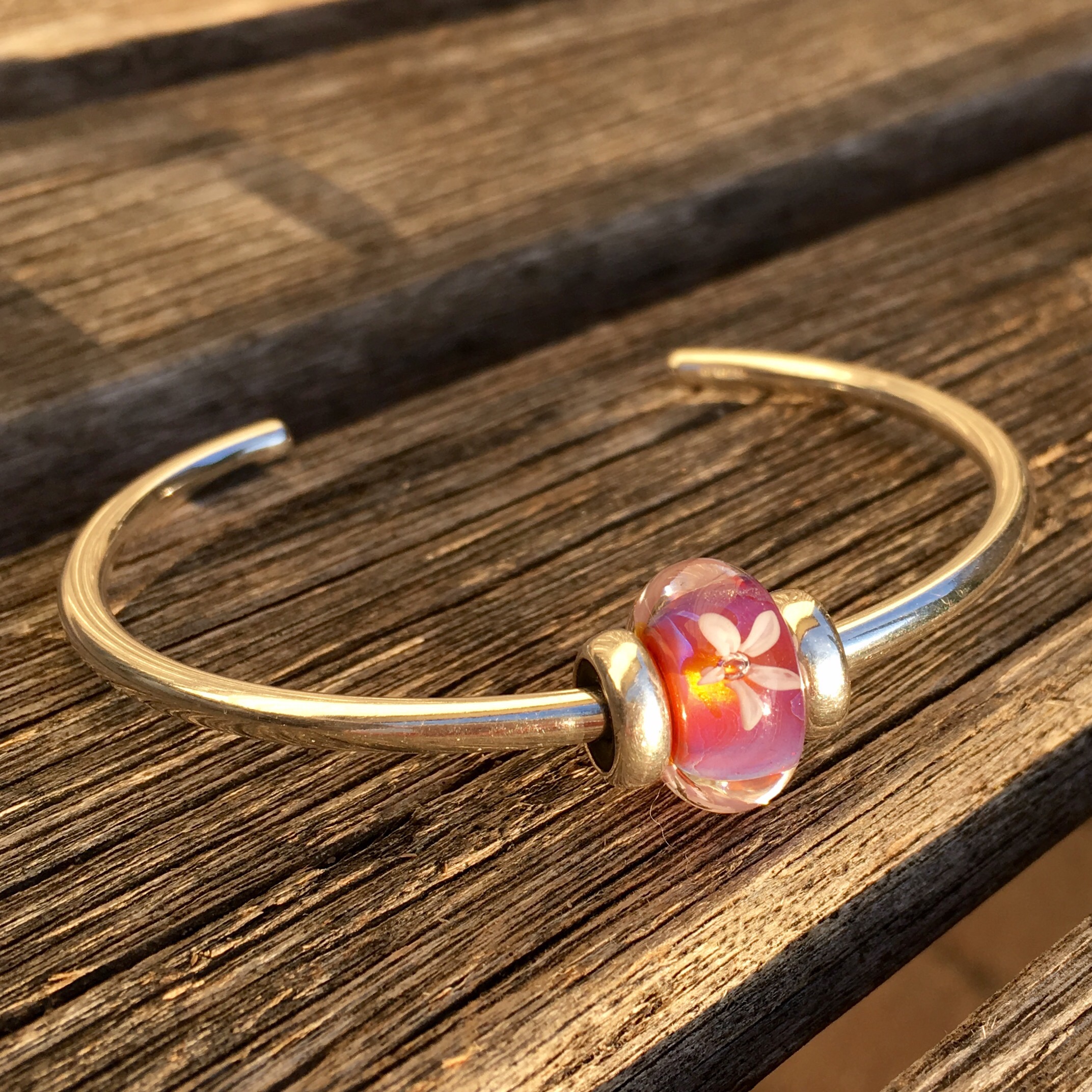 There’s a promotion for some Trollbeads sets going on now of the Soft Sunrise Bangle or the Soft Sunrise Bracelet, both featuring the Sea Anemone glass bead. I think the bangle set is a great way to get into Trollbeads if you’re just starting out as you don’t need to buy anything else and other branded beads will fit on it. They will fit on the chain too, but it helps to have stoppers to keep things from sliding around. Here are photos of both sets.