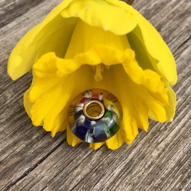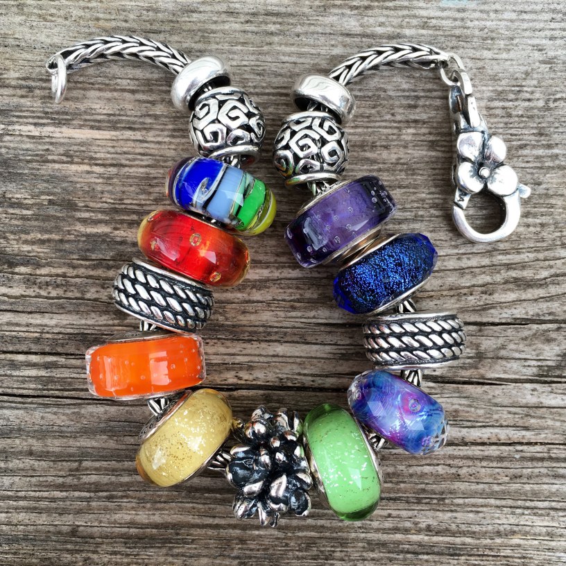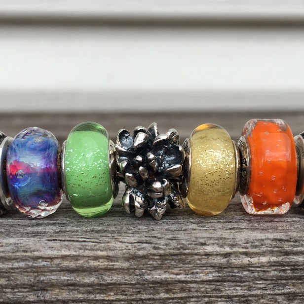 I hadn’t used my Trollbeads Chakra Colours bead for a while so thought I’d bring it out. I put together a bracelet using the bead and then one bead for each of the seven colours represented. However, because I don’t have a massive collection I had to use beads of different shapes and brands, so it’s not exactly a cohesive look. Plus, I built the bracelet from one end, putting the colours in the order they are on the bead instead of building the bracelet from the centre out like I usually do. So, let’s just enjoy the pretty colours and not worry about the composition, ha ha!