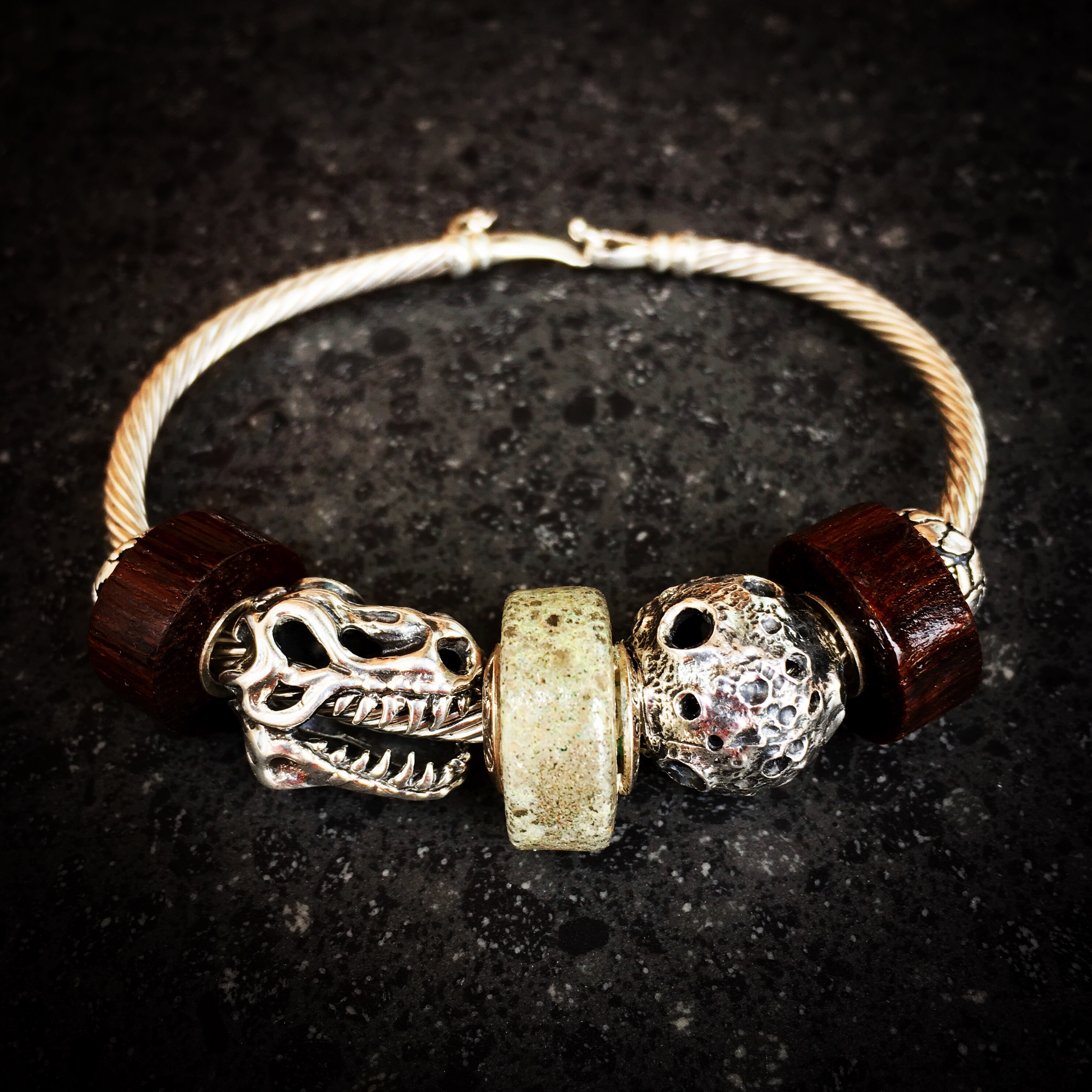 For this bangle, I was thinking of an earthy style, with the dinosaurs going extinct due to an asteroid sending up an ash cloud. And I was trying to balance the sizes. The middle bead is called Humerus. Everything on this bangle is Ohm-Earth-ish Stoppers and Bolly Wood beads on the Twisted Bangle.