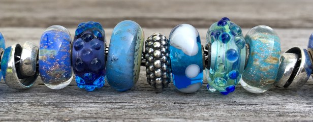 Left to right below are the Sunbeam Spacer, Ice Blue Bud, Seabed Stripe, a unique, Neverending, Fountain of Life, Blue Fizz and Beach.