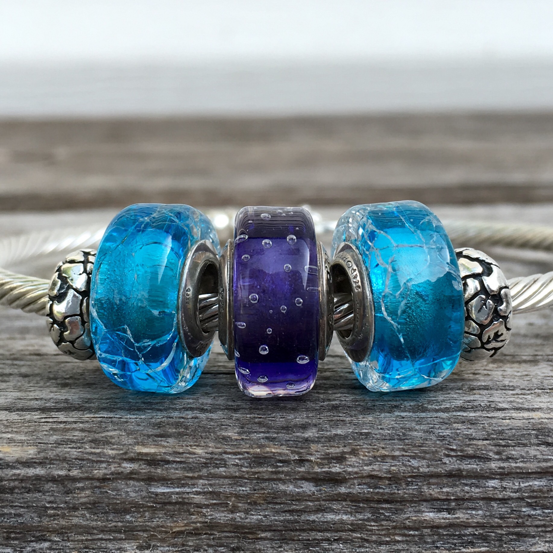 They feel smooth to the touch for the most part. Mike described them as being mostly smooth with the crack effect being smoothed a little by heat. Here they are with the purple bead from the Six Pack collection, Get in Shape.