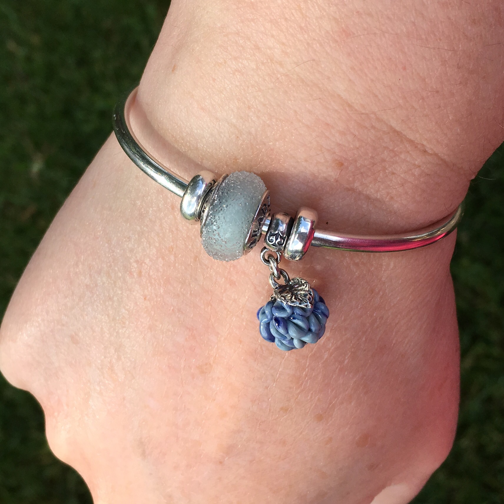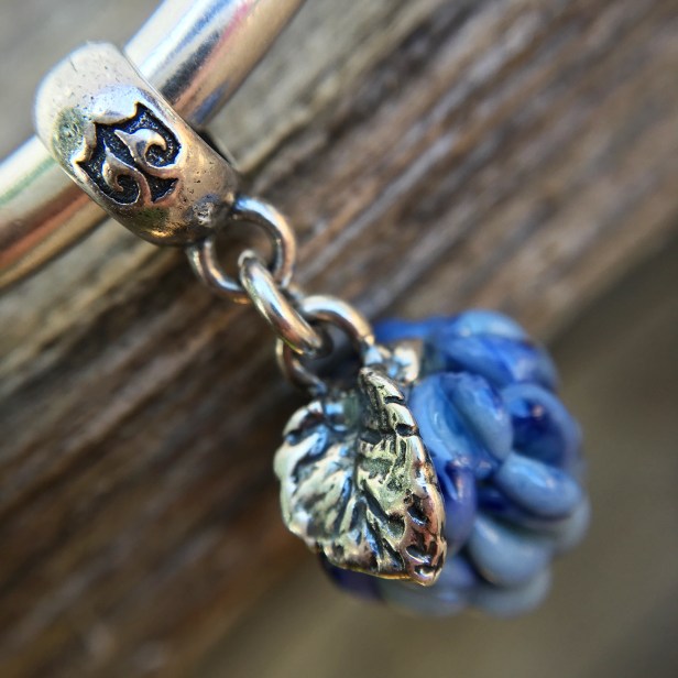 The Morning Dew and Youngberry beads from True Beadz are made of silver and glass. Youngberry is the dangle on the left and Morning Dew is on the right.