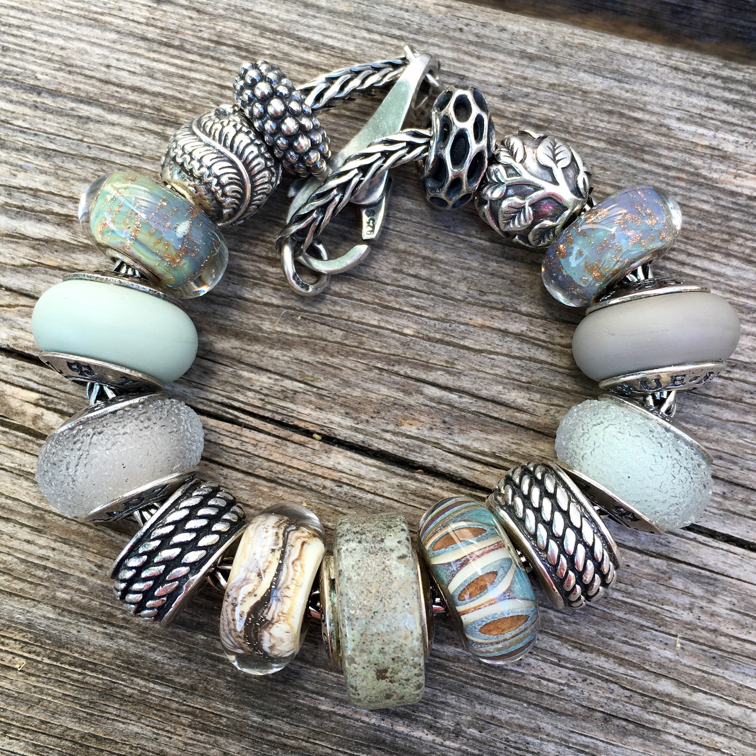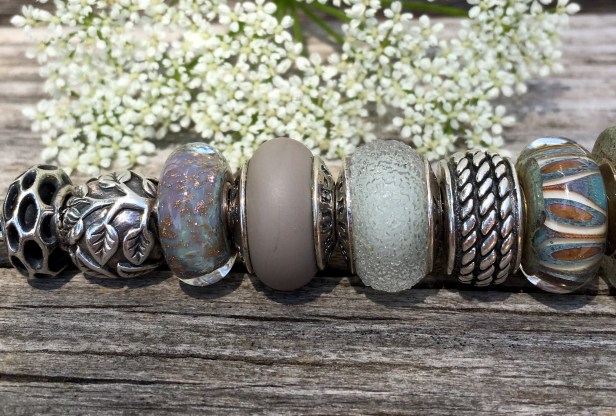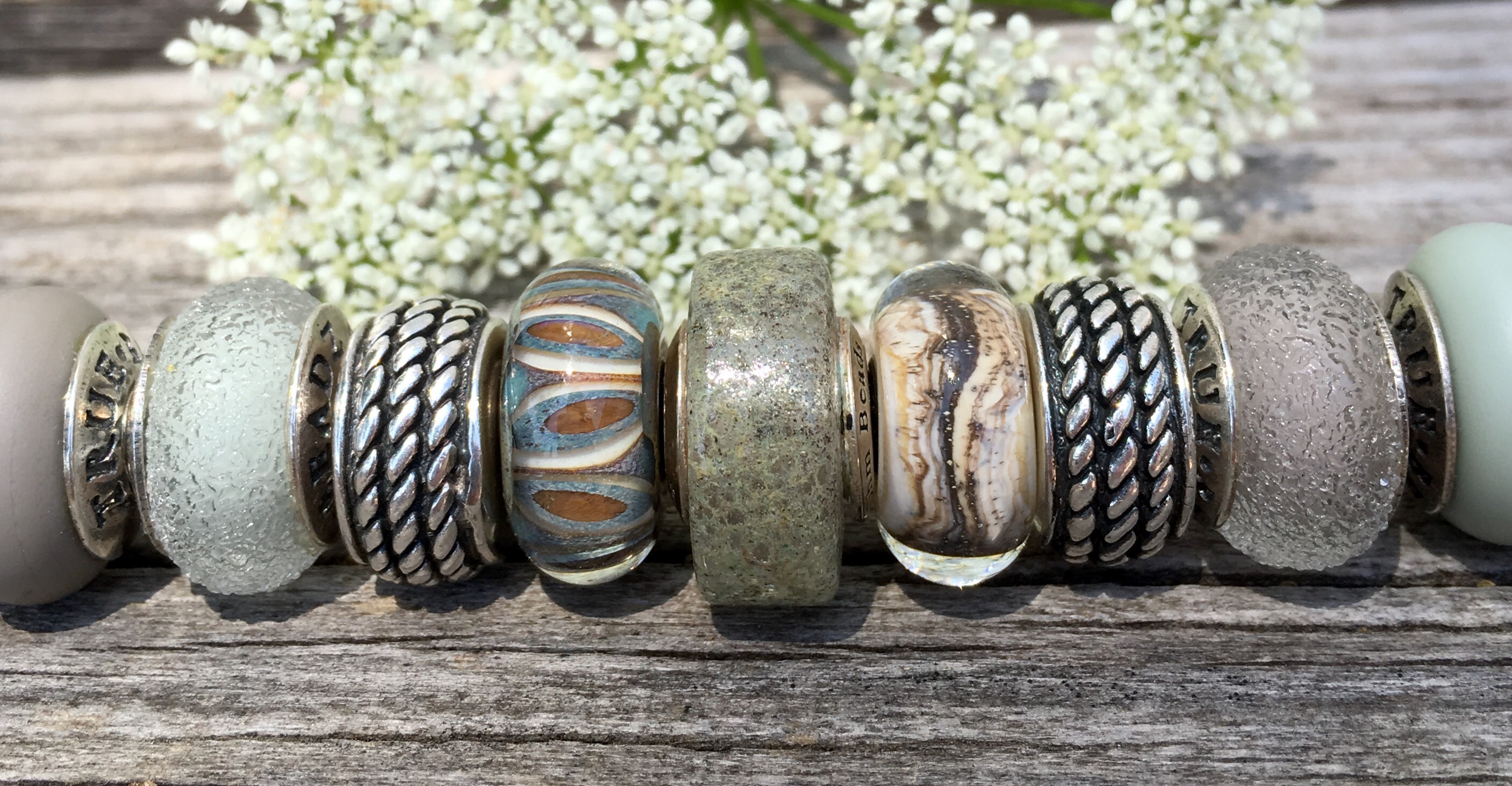 Below left to right are the Trollbeads Beehive Spacer, Redbalifrog’s Tree of Life, Trollbeads Blue Desert, True Beadz True Touch Castle Stone, True Beadz True Taste Linen, Redbalifrog Rope and Trollbeads Sandstone.