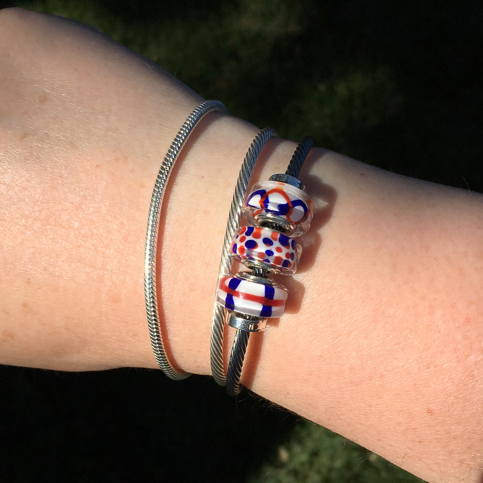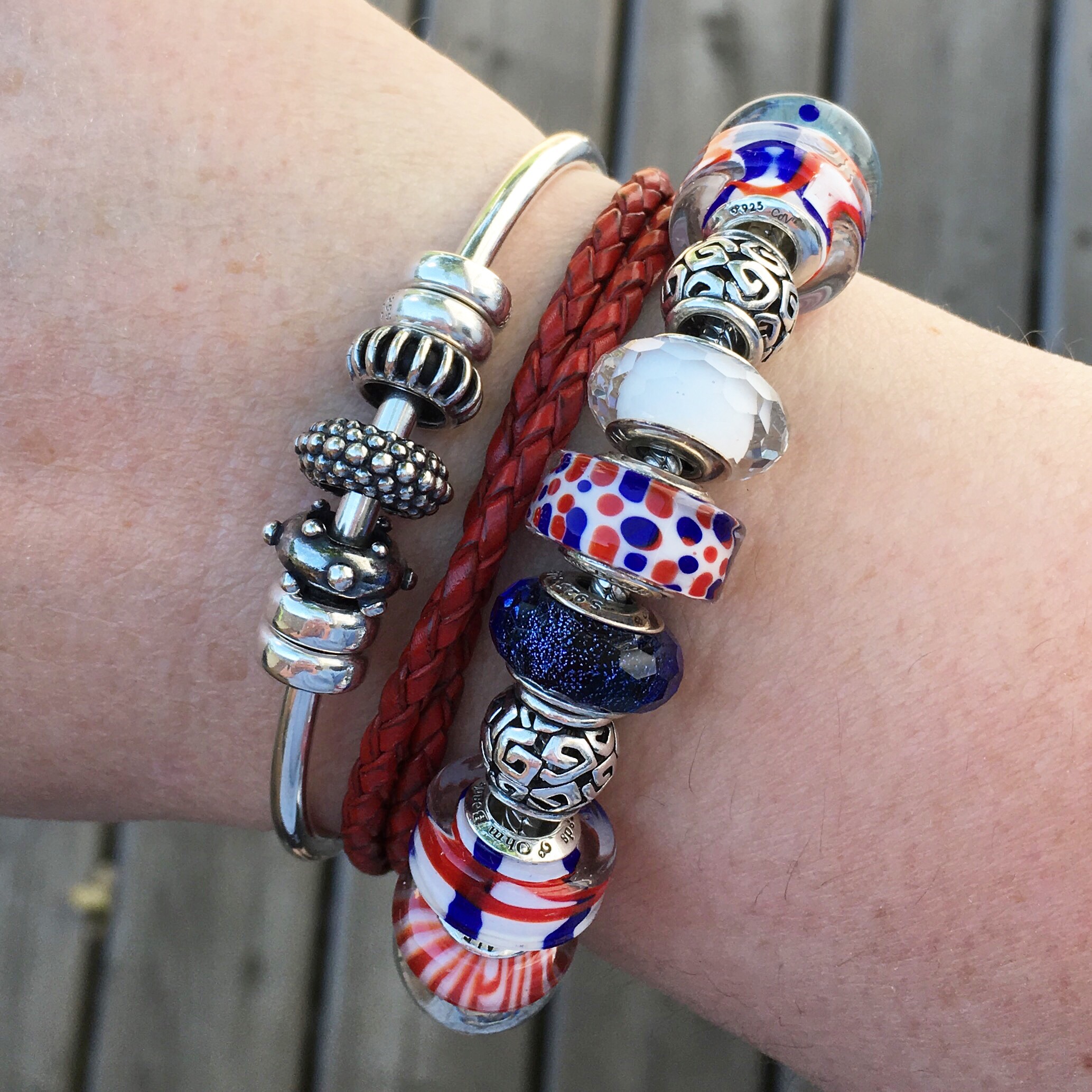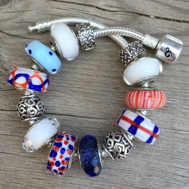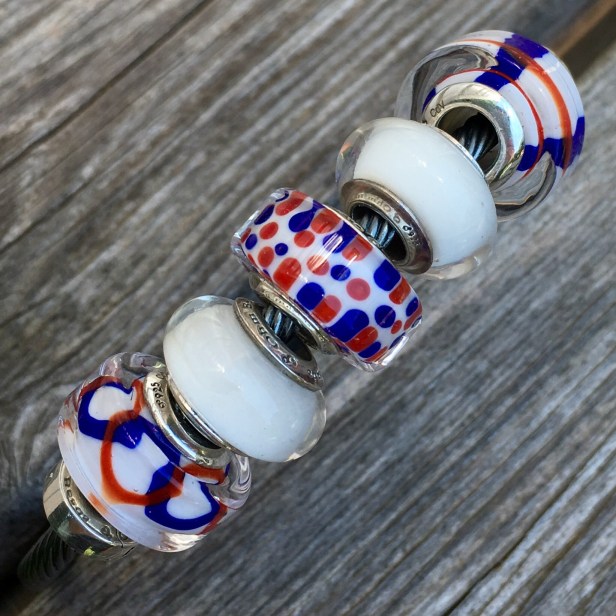 I did try a bigger bracelet with some older Pandora beads in red, white and blue. These are the Metal-ness locks on the clasp bracelet.