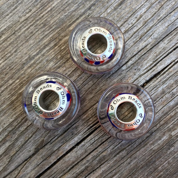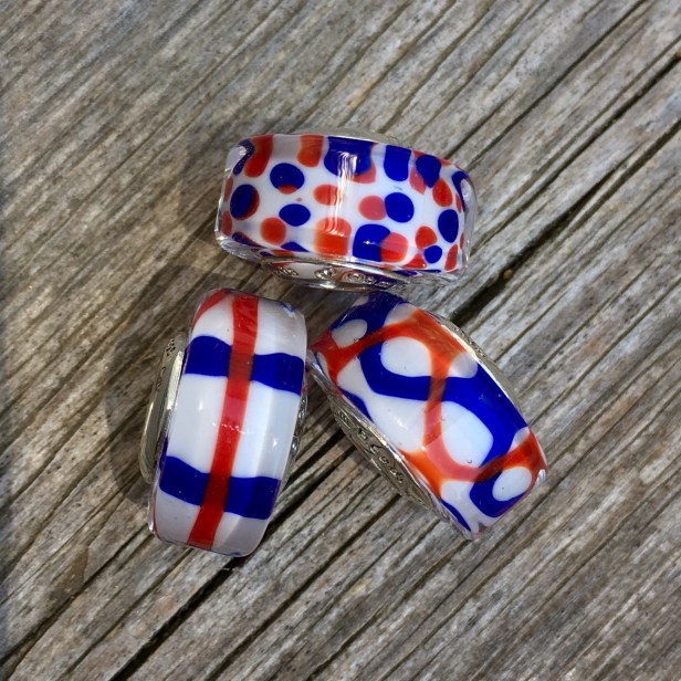 Ohm Beads has brought out a trio of glass beads in red, white and blue, perfect for Americans for July 4th! We live close to the border, as most Canadians do, so I always enjoy a red, white and blue theme at this time of year. Called Courage and Loyalty, they are sold as a trio, just like Animal Aptitude. They are the barrel shaped beads, which really add some interest to a bracelet. The pattern is at the core of the bead and surrounded by clear glass.