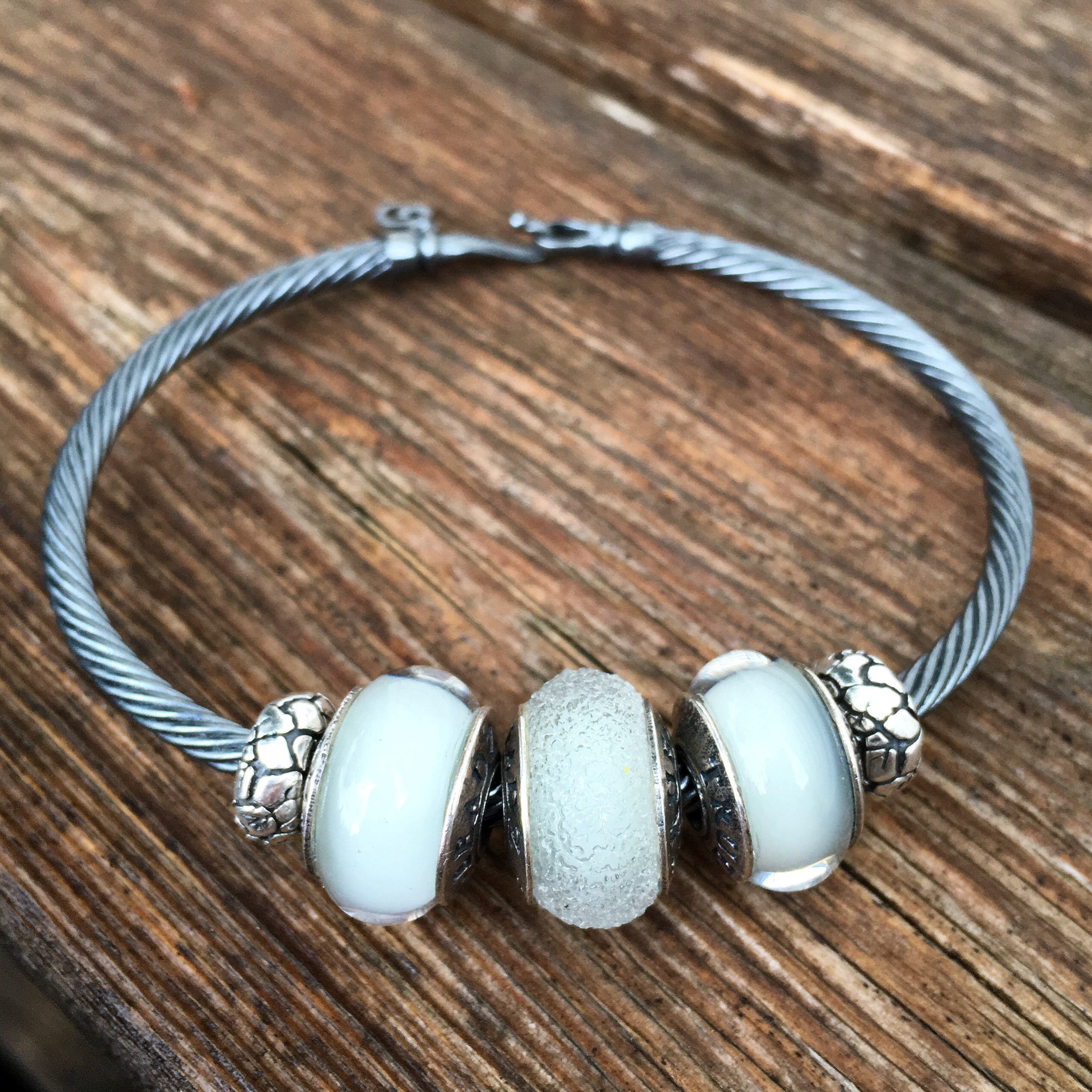 I’ve been wearing the Ohm Beads Dirty Twisted Bangle for a few days now and really, really like it. It’s the same oval shape as the regular Twisted Bangle which I’ve had for some time and it’s super comfortable. I wear it a lot with no beads actually. The Dirty Twisted Bangle makes beads really ‘pop’. Check out the True Beadz in the Linen shade against the dark grey of the bangle.