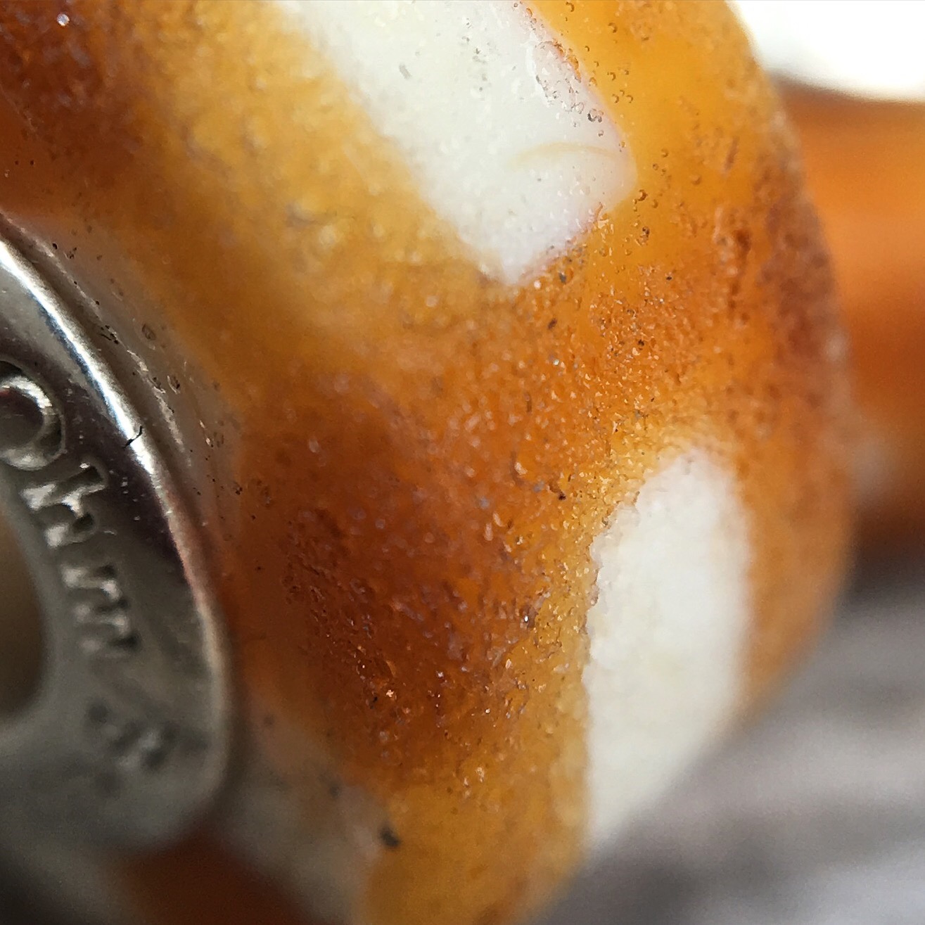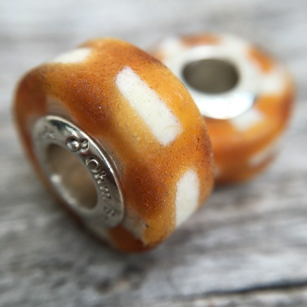 There is a bit of texture on the beads, not quite as raised as the Taste True Beadz, but more like a fine salt or sugar. The Latte bead, which was a Bead of the Month about a year ago, is smooth, but the colours are the same. I’ve got them on the Dirty Twisted Bangle here with the the Cold Milk beads in between. The stoppers are called Earth-ish.