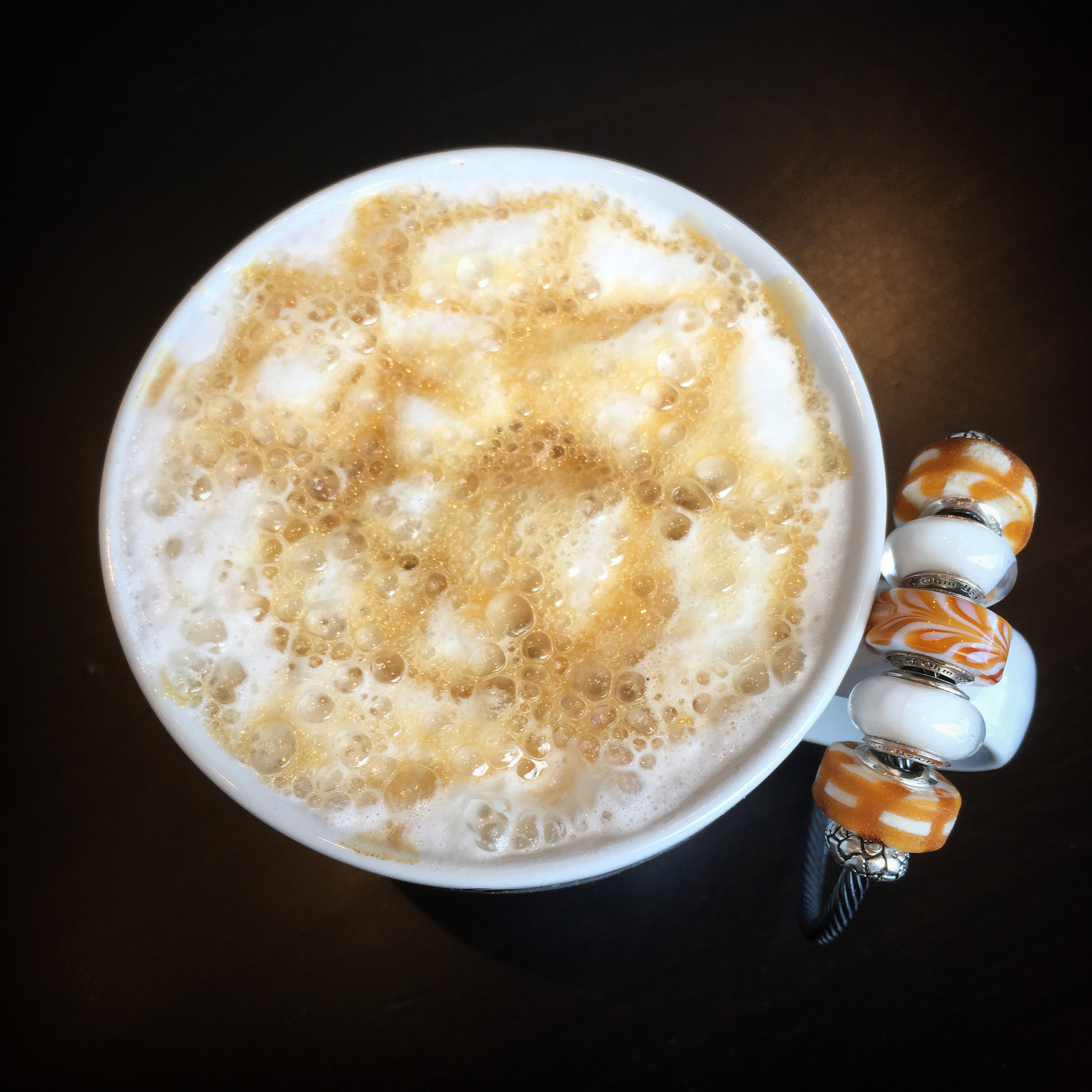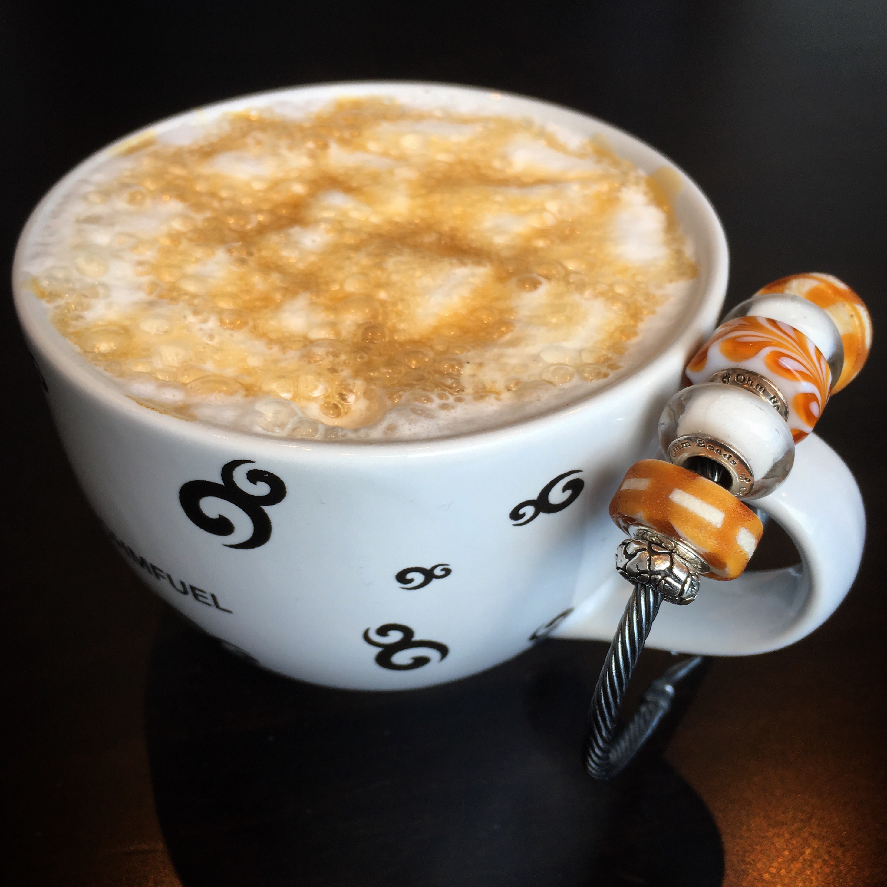 The July Bead of the Month is a pair of glass beads called Caramel Latte and they come bundled with a coffee mug! I have the mug sitting in my bead area and it’s currently holding beads I need to photograph, but I took it over to my local Starbucks yesterday and asked them to make a drink in it.