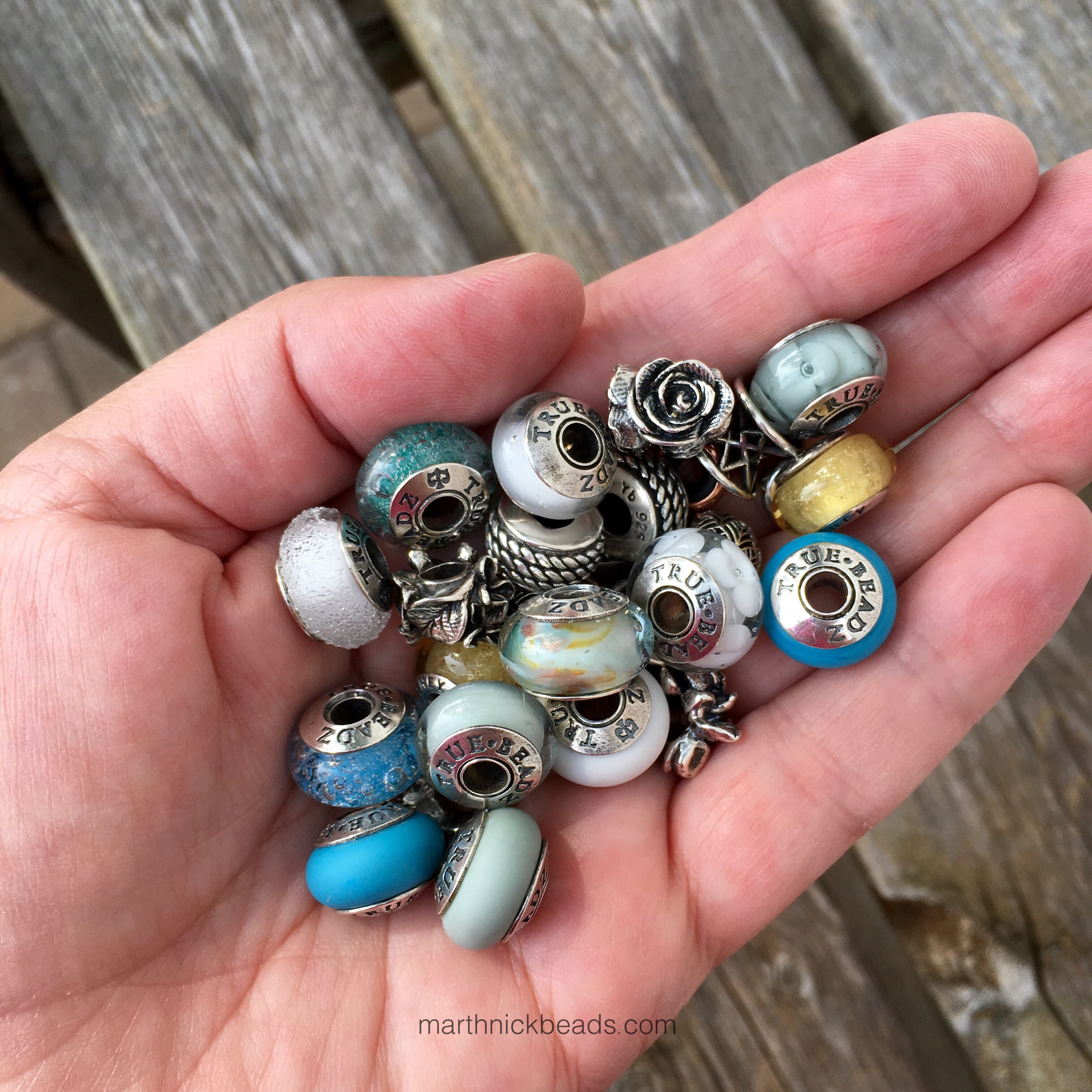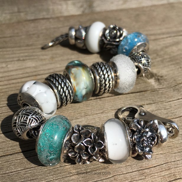 Now for a full bracelet, using the two new Alchemy Beads, the white Siberia beads, the Redbalifrog Rope silver beads, Pandora silver Tropicana beads plus four silver True Beadz: Shells n’ Star, 3 Roses, Lilac and Lotus.