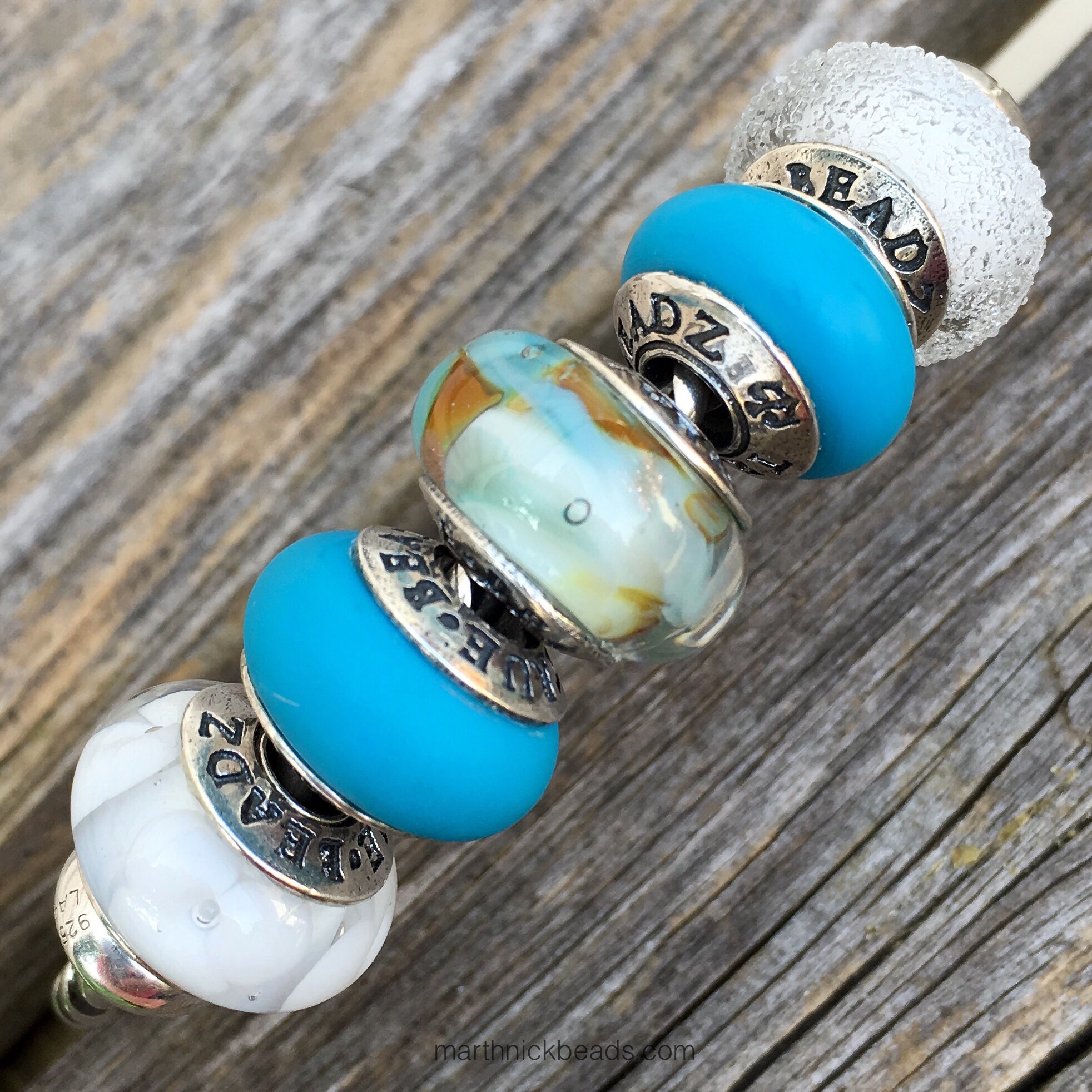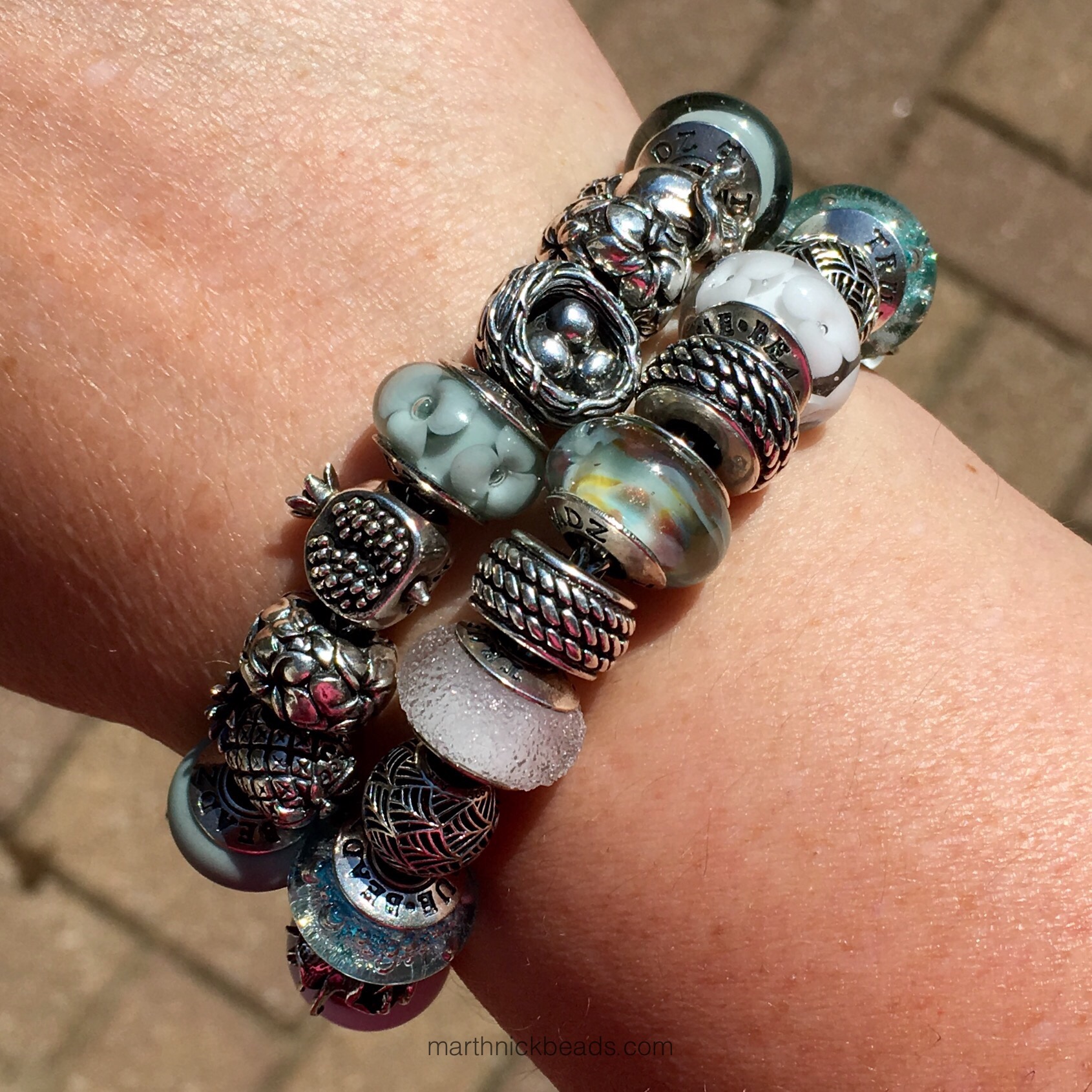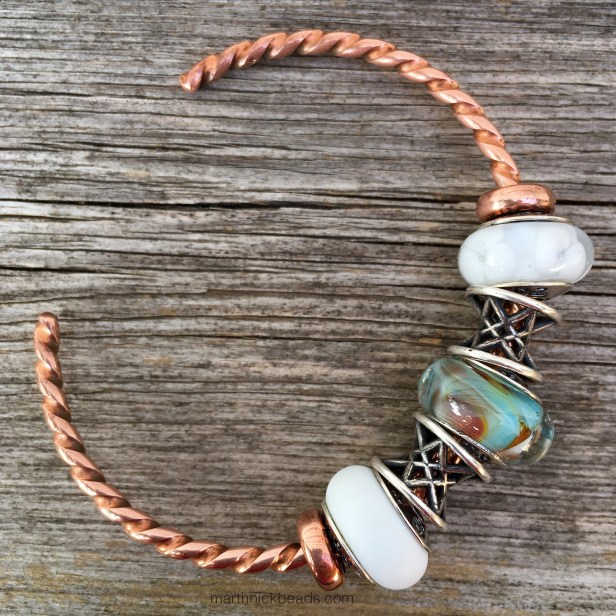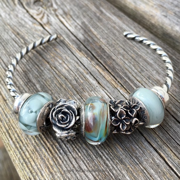 My favorite look is the silver bangle with Blue Mist, Lilac, and 3 Roses. Love how you arranged it on each different carrier (copper, bangles, chains) and really showcased this bead’s versatility. Great purchase!