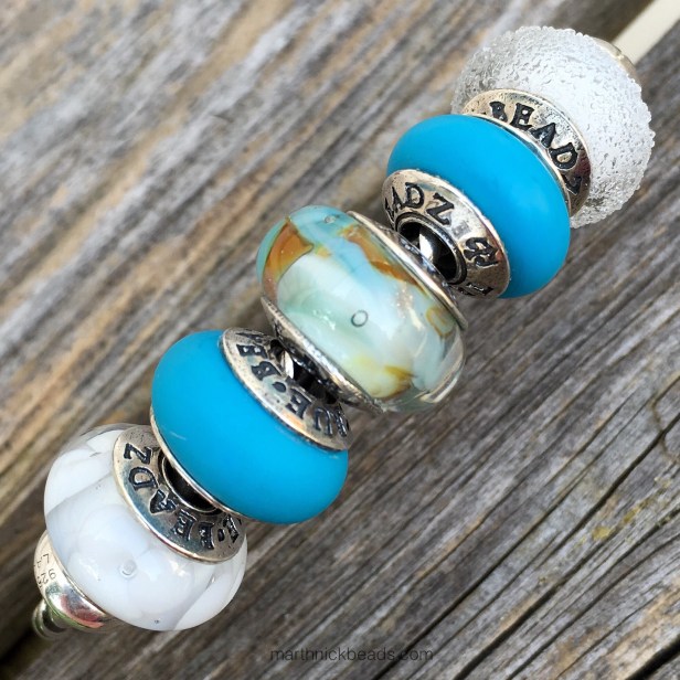 I bought a bead while on a little road trip last week to Pittsburgh/Cleveland. It’s called Dancing Fairies Meadow by True Beadz and is incredibly versatile. I love beads that have different colours in them so you can get a range of looks! It’s a bit like a painting, with white, blue, yellow and some coppery bits too.