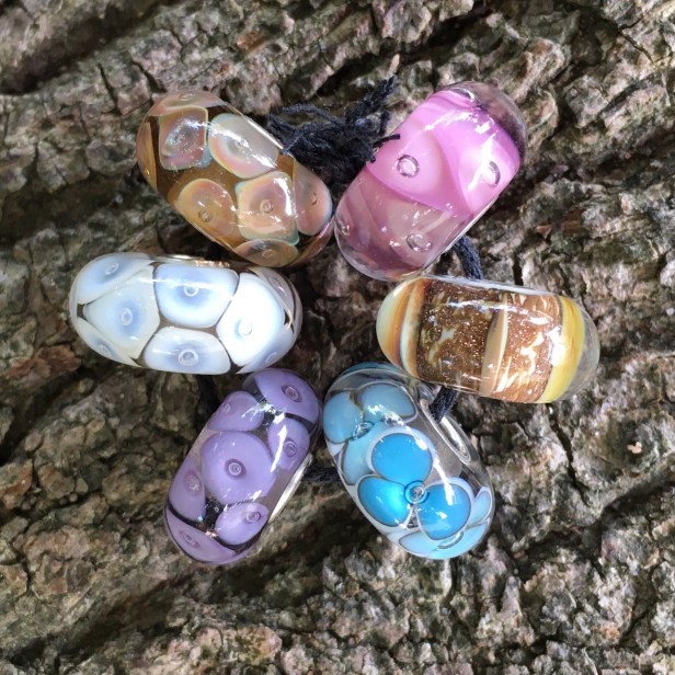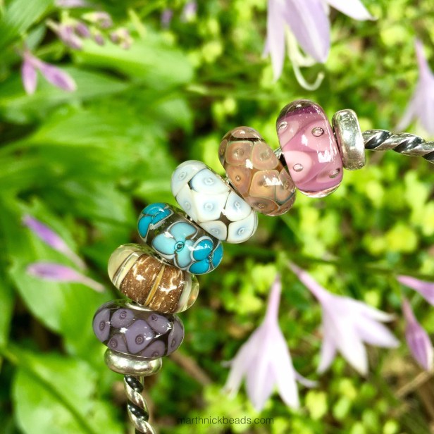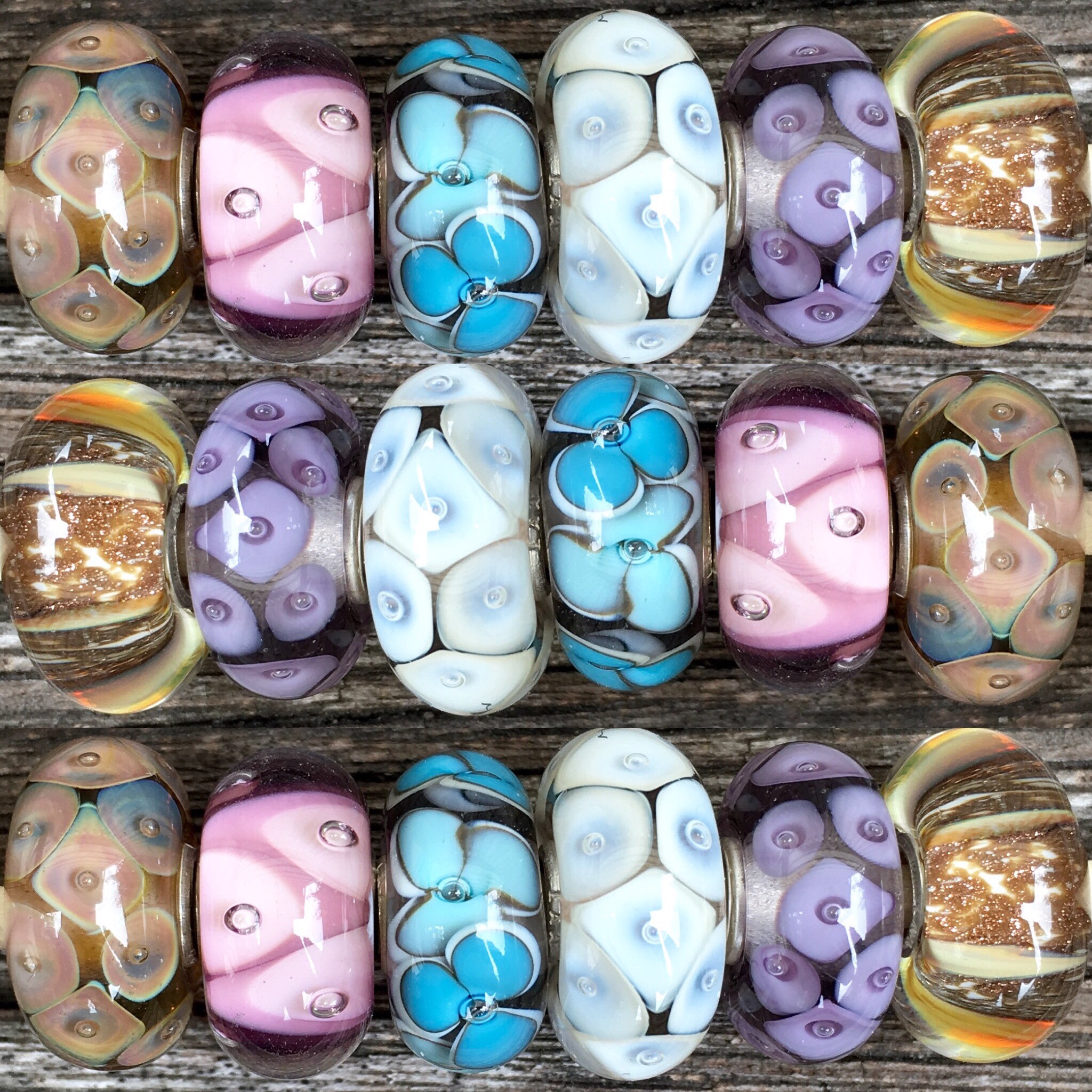 For fun I made a picture up of the beads in triplicate. Left to right on the top row are Nature Unity/ Soul of Waves/ Soul of Flowers/ Nature Dream/ Nature Friendship and Soul of Sunshine. By the way, I took these photos outside but on different days and at different times so the pink and purple beads especially vary in these photos a bit.