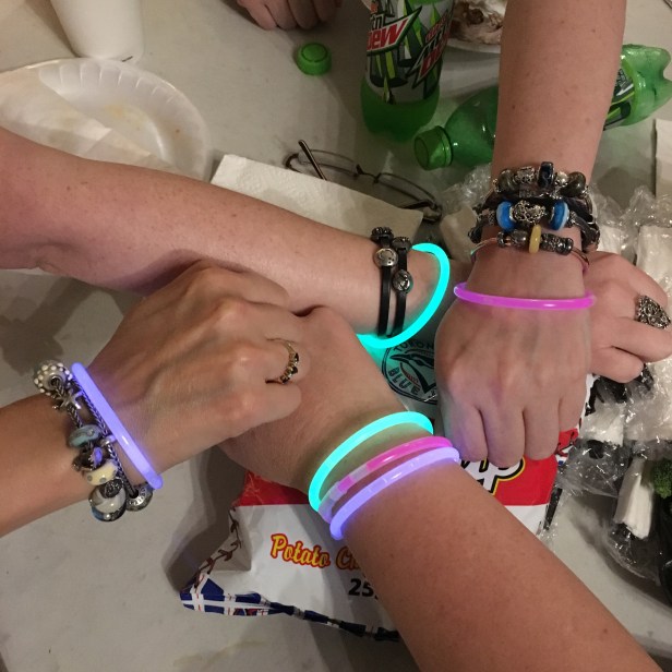 There was a little party at the hotel that night. GLB bought drinks, pizza and wings (again, amazing hospitality) and we brought some Ketchup chips from Canada, which lots of Americans have never heard of. Sarah brought some Glow-Sticks we could wear as bracelets and we passed them out. I *think* this photo below is of Kim, Lisa, me and I’m not sure of the fourth person, sorry!!
