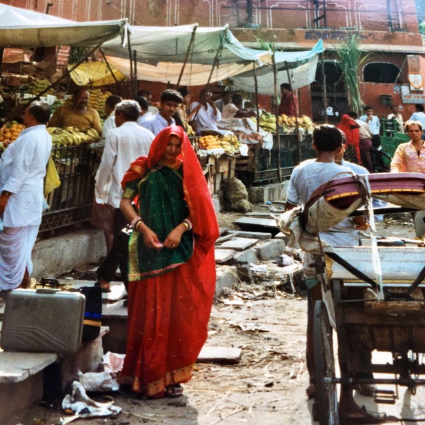 …plus this photo I took in Jaipur. I’ve always wondered where this lady was going. You can see her suitcase off to the side. All the women looked so elegant in their saris in India.