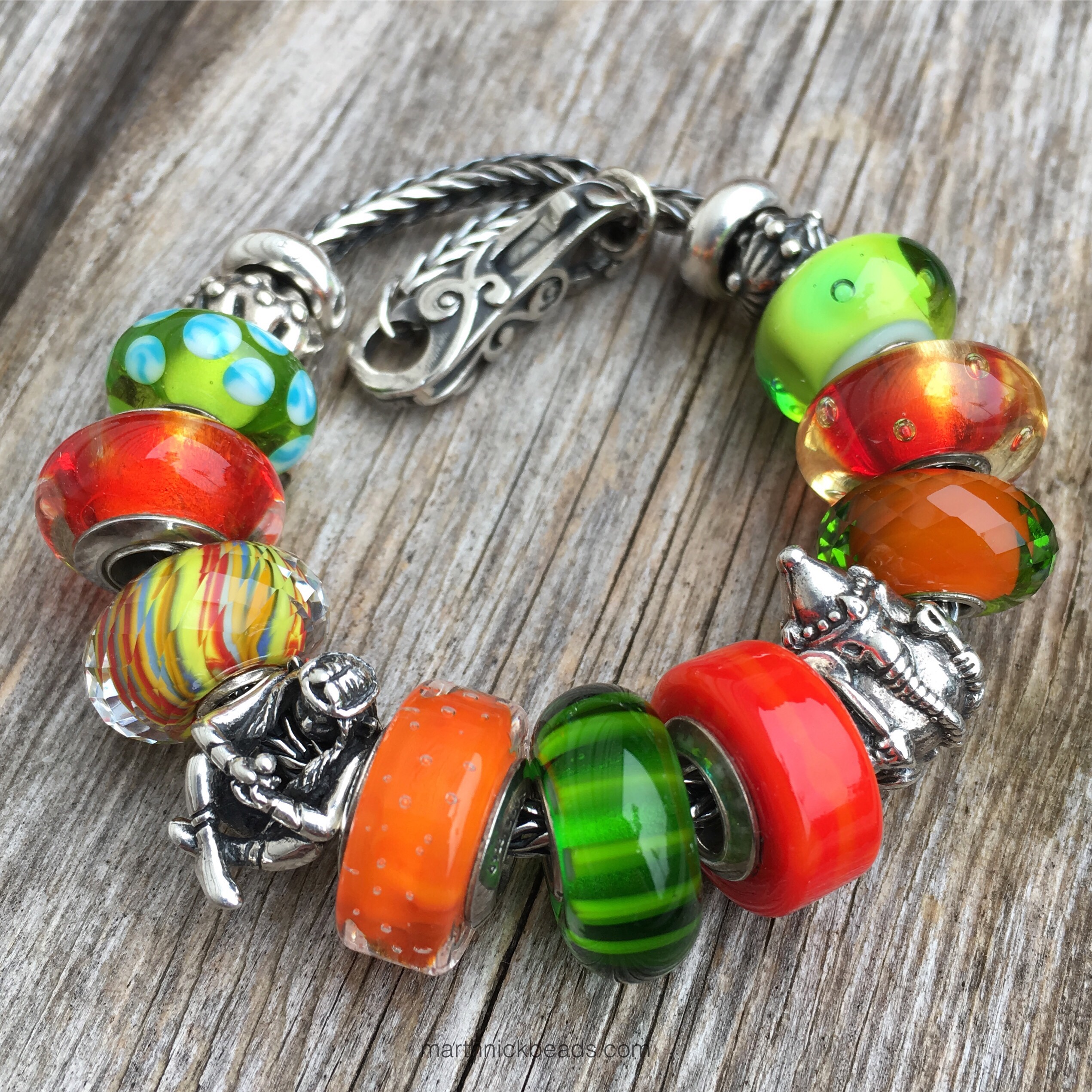 Below left to right are Trollbeads Pumpkin Ornament/ Turquoise Green Dot, Ohm Beads Sky Fire, Trollbeads River of Life, Ohm Beads My Precious and Live Your Fantasy.