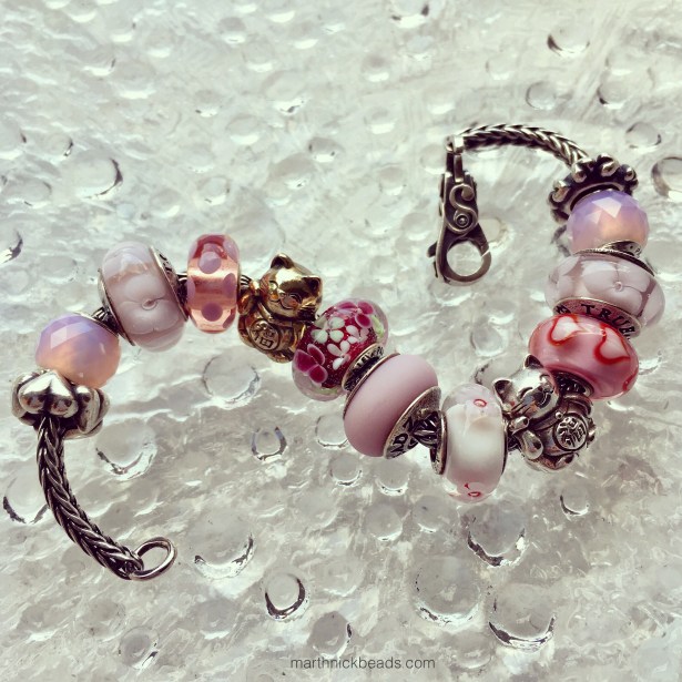 Lastly, I made up a pretty pink bracelet using both cats. Below left to right are the Trollbeads Spacer Connected Love, Pandora Geometric Facet, True Beadz True Blossom Baby Pink, Trollbeads Summer Dot, Maneki-Neko Brass, Pandora Flower Garden, True Beadz True Touch Baby Pink, Pandora Cherry Blossom, Maneki-Neko Silver, Trollbeads Asian Hearts, True Beadz True Blossom Baby Pink, Pandora Geometric Facet and Trollbeads Heart Spacer.