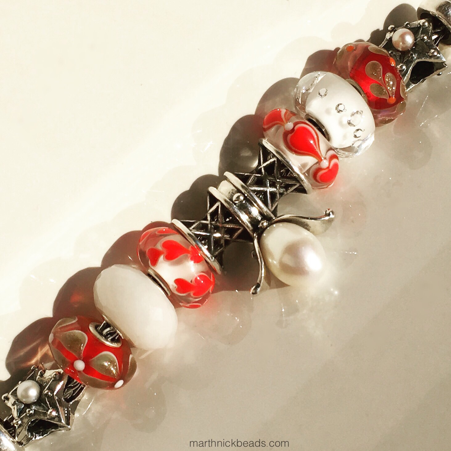The red beads are from the Wishes and Kisses Kit. Plus, left to right are the Star of Wisdom, Milky Quartz, Smile of Stars, Budding Pearl Spacer, Smile of Stars, the Diamond Bead/White and the Star of Passion.
