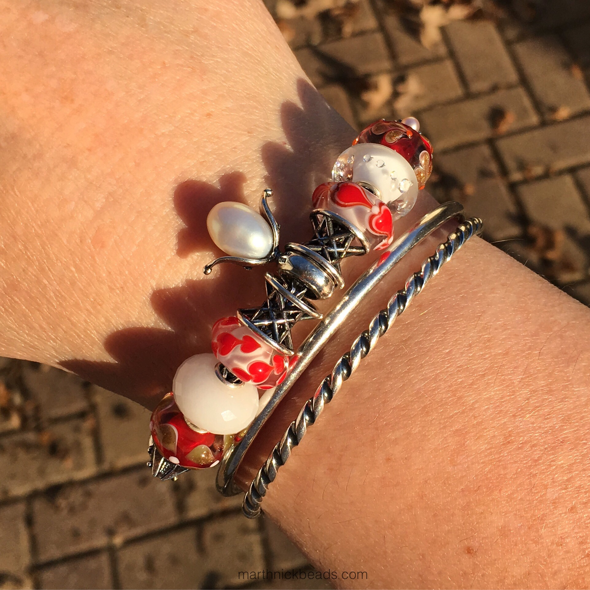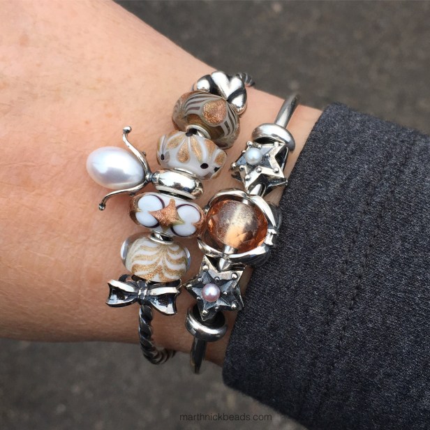 The Trollbeads Budding Pearl Spacer came out with the Winter Collection and you can see a picture of it on the Neck Bangle here on my Live Image Preview. But I think it’s also lovely for bracelets! It won’t go on leather, but works really well on the Twisted Bangle, regular bangle and foxtail chain bracelets. It’s so elegant and works well with just a couple of other beads, in this case the Milky Quartz and the Diamond Bead, White.