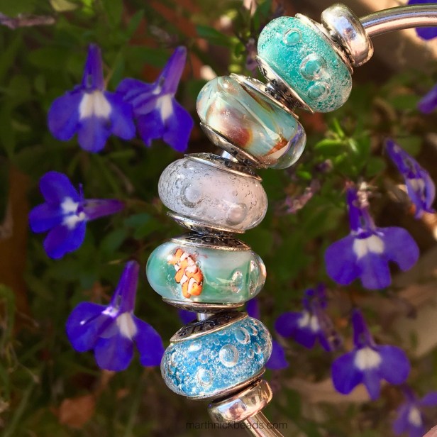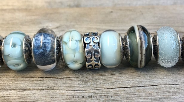 I thought I’d try the Alchemy Snow with the two other Alchemy beads. Top to bottom are Alchemy Breeze, Dancing Fairies Meadow, Alchemy Snow, a True Treasure and Alchemy Waterfall. I’m just going to come right out and say that I think these beads look incredible in the sun! The bubbles almost look like they’re moving!