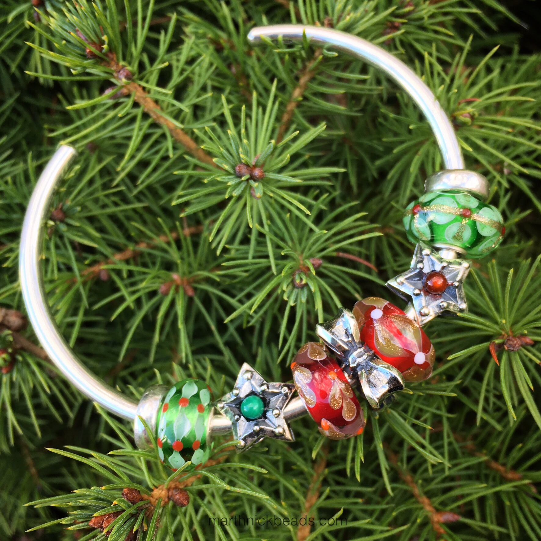 Here’s a bangle with four of the beads, the Bow Spacer and two stars, the Star of Hope (green) and Star of Leo.
