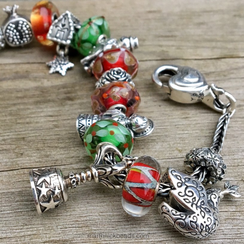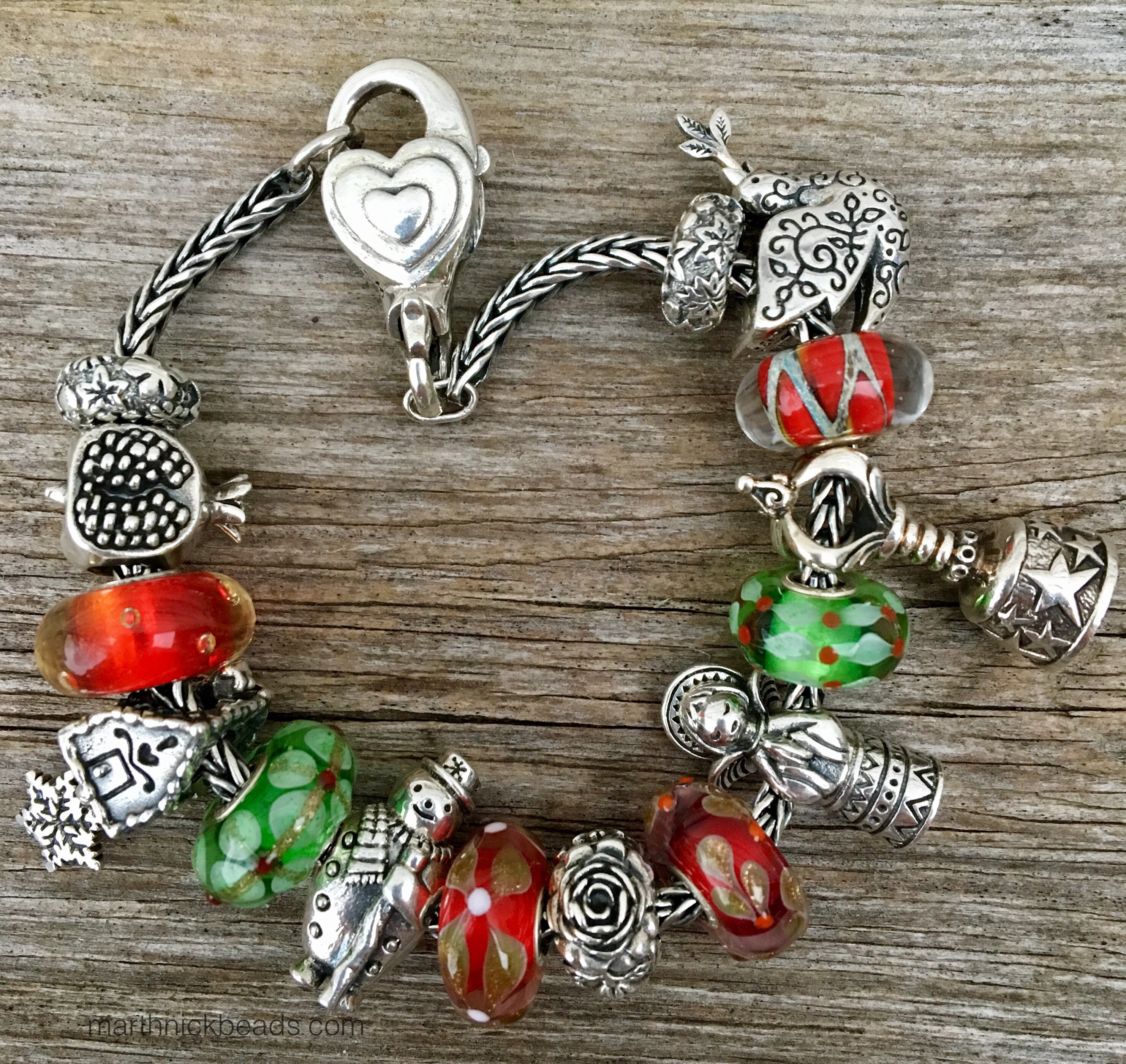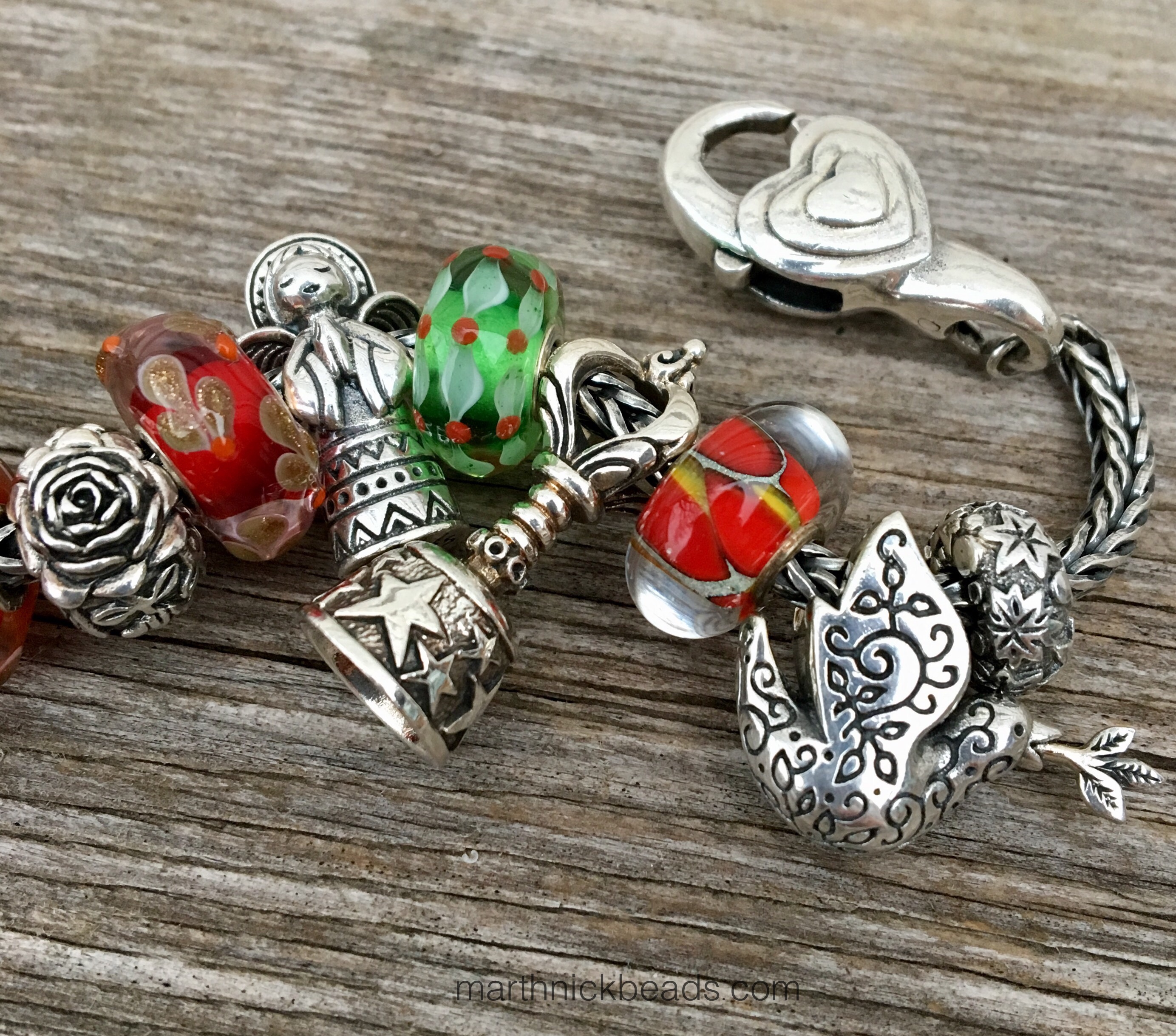 On this bracelet the glass beads are all Trollbeads. The red one on the left is a unique, then the next four are from the Wishes and Kisses Kit and the one on the right is from an older holiday kit that I found somewhere by itself on sale. The silver beads are all Redbalifrog.