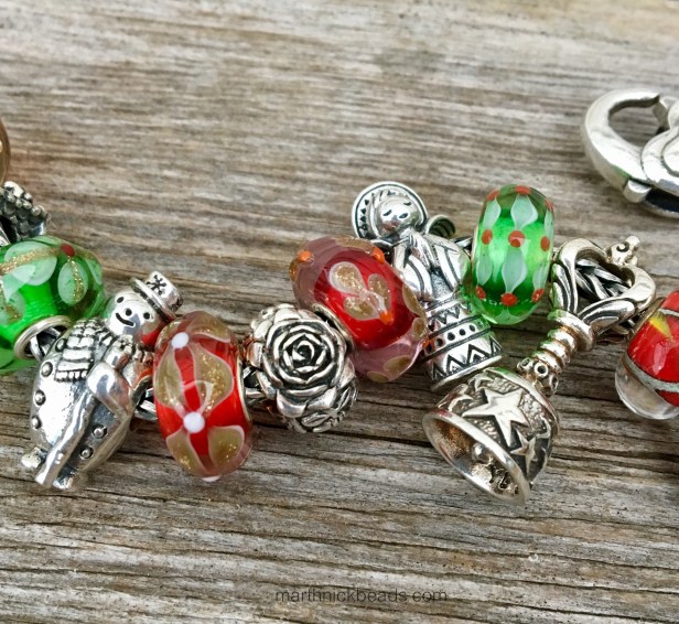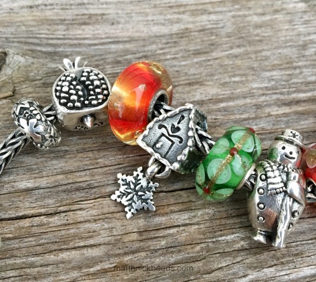Below left to right, the silver beads are Snowflake Stopper, Pomegranate, Gingerbread House and Snowflake and Icy the Snowman.
