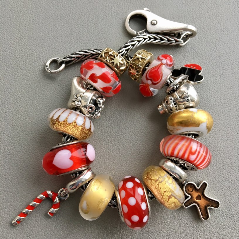 I did find the Redbalifrog brass Star Stoppers to work well with this bracelet. Below left to right are a bead from the Trollbeads Wishes and Kisses Kit, Pandora’s Santa’s Stocking, Oasis Lotus, Pandora’s Red Love, Pink Hearts (I found the Pandora website where they list the discontinued charms), Pandora’s Candy Cane, Desert Mirage and Pandora’s Minnie’s Signature Look Murano.