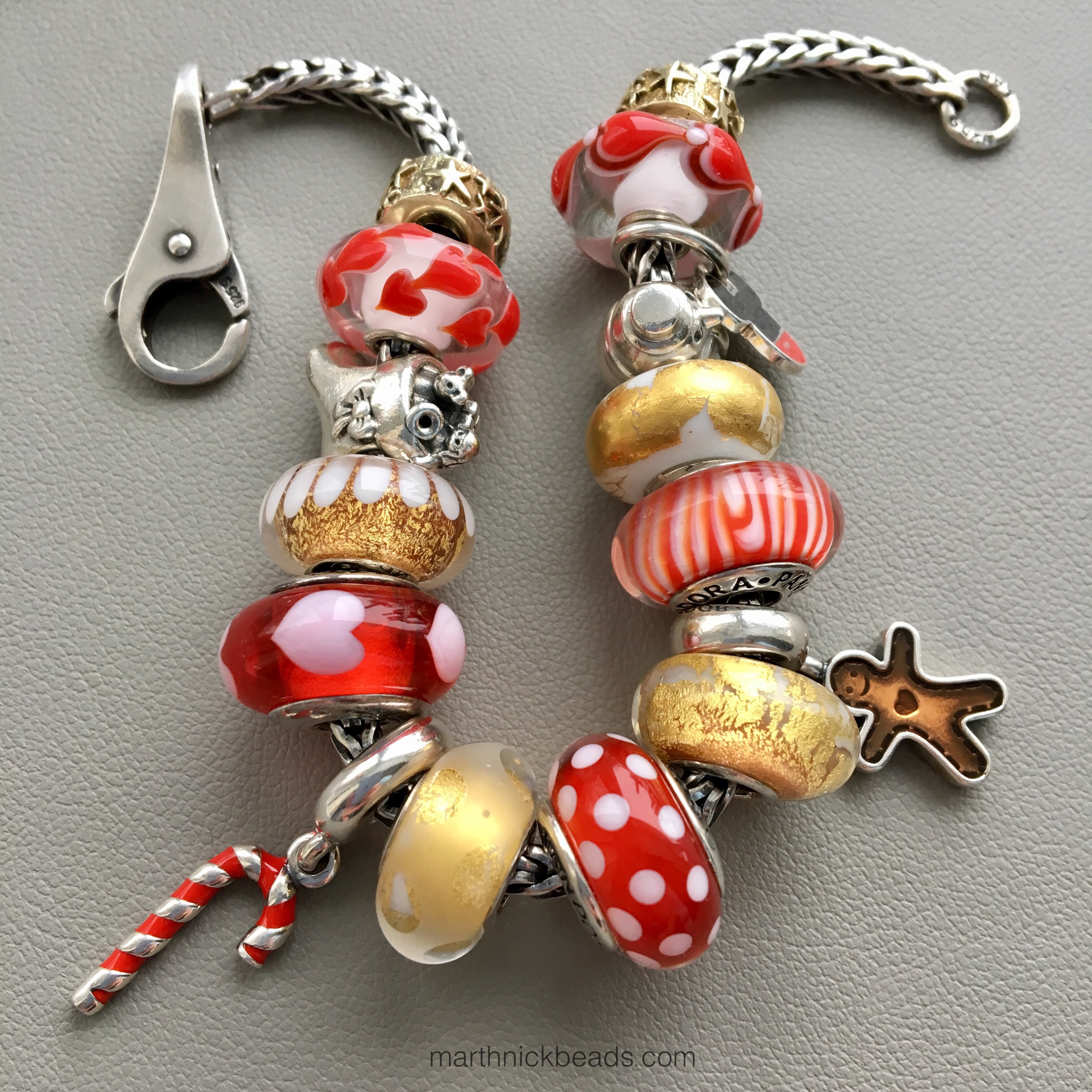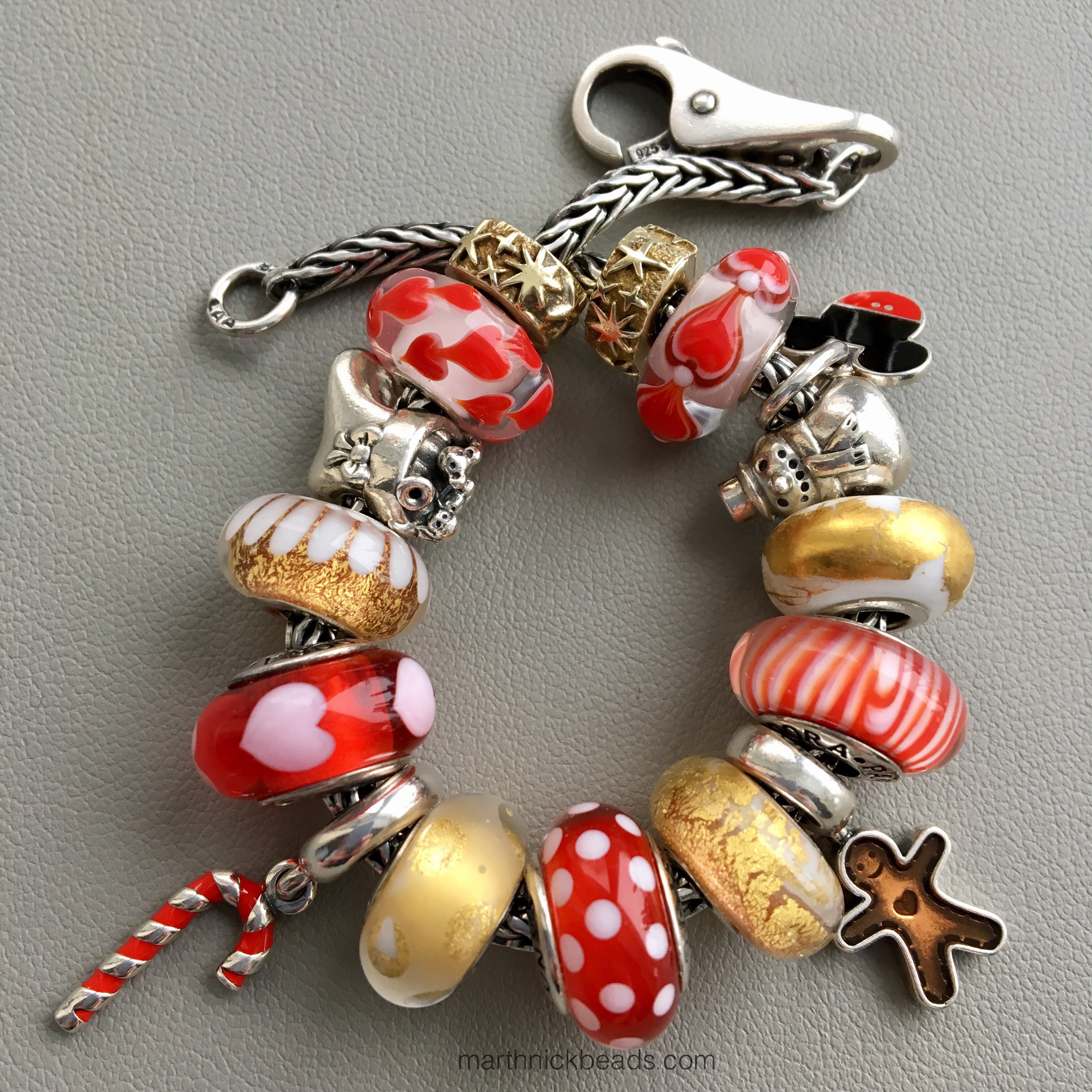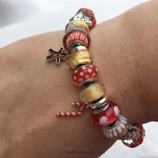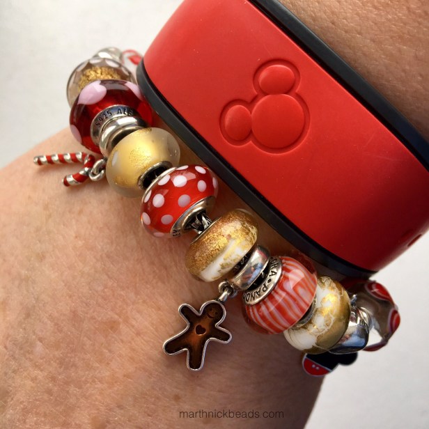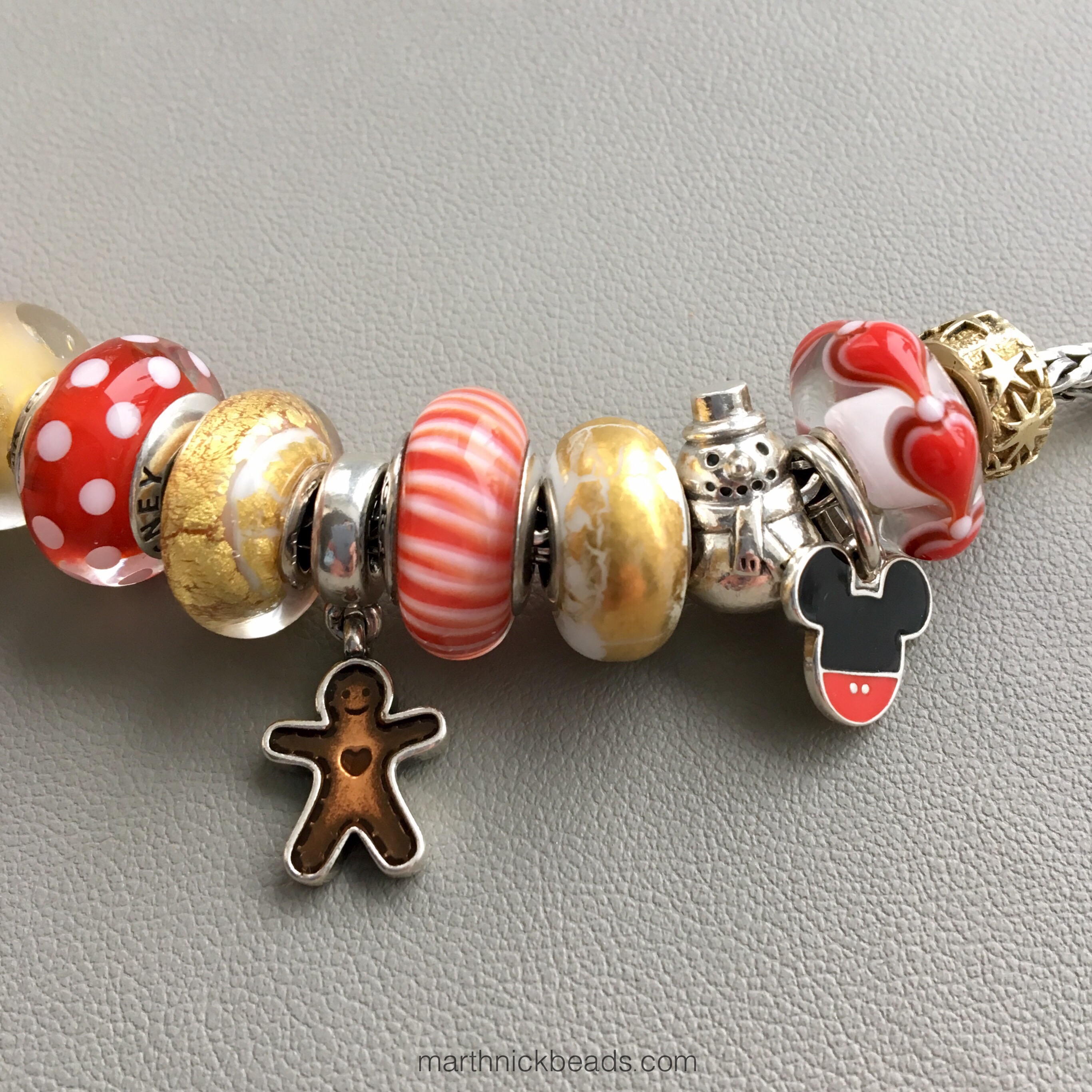 Below left to right after Minnie are Golden Dunes, Pandora’s Gingerbread Man, Pandora Candy Stripe Murano, Streams of Gold, Pandora Snowman, Pandora Disney Mickey Icon, a Trollbead from the Wishes and Kisses Kit and the Redbalifrog Brass Star Stopper.