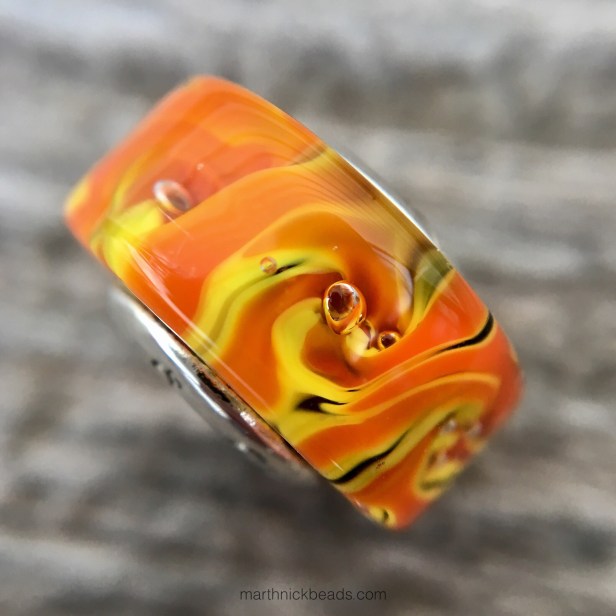 In early January Ohm Beads released a couple of gorgeous Limited Edition glass beads. Fireball has swirls of yellow and orange with a bit of black, but each bead will be slightly different, as most glass beads tend to be. I just now read the description of the bead on the Ohm Beads website and burst out laughing. “…or the match you light after you dropped the kids off at the pool.” LOL!!!!!! I would bet money that Mike at Ohm wrote that! LOL!!!! Anyway, it’s $35 USD/ $45 CAD, as is the Waterfall bead. Here’s a macro shot of the Fireball.