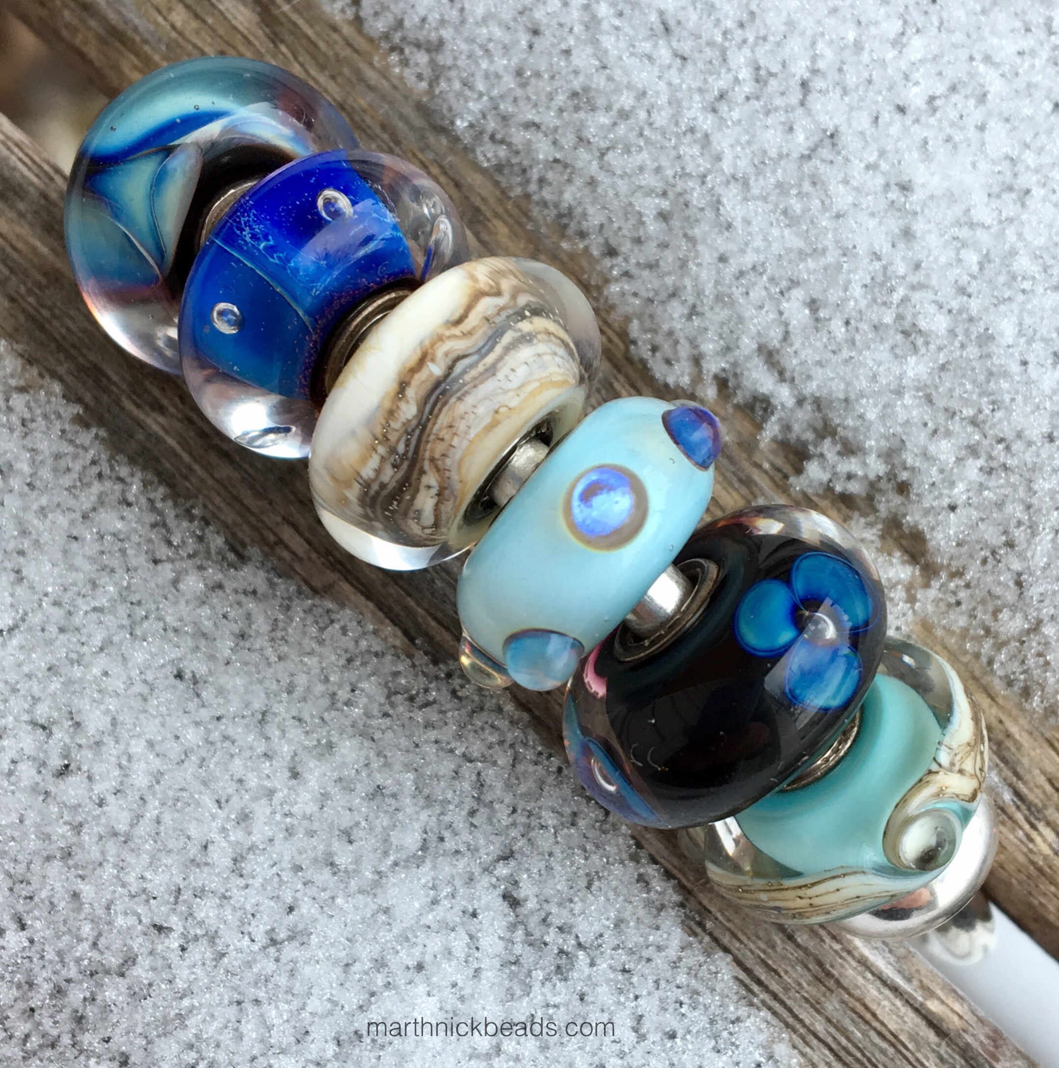 Your azure bubbles are spectacular. Besides Trollbeads Fest last fall, I have never seen Trollbeads in person and the azure bubbles I purchased has a green tint to it, reminding me of atmospheric halos (nerdy I know). I do love these blue combos, they are so versatile and calming. I have been waiting since November for my first cozy to arrive from overseas when it was left out of my order π. Now that I see how beautiful it is I want it even more. I agree with Tracy that blue desert is spectacular and I will need more than one. For now, I’ve collected sand beach in multiples because I find it so versatile, but again, a big difference between the two that I purchased online. I do have a small shop near me but I am too chicken to go in because I am afraid of the damage I will do to my wallet!