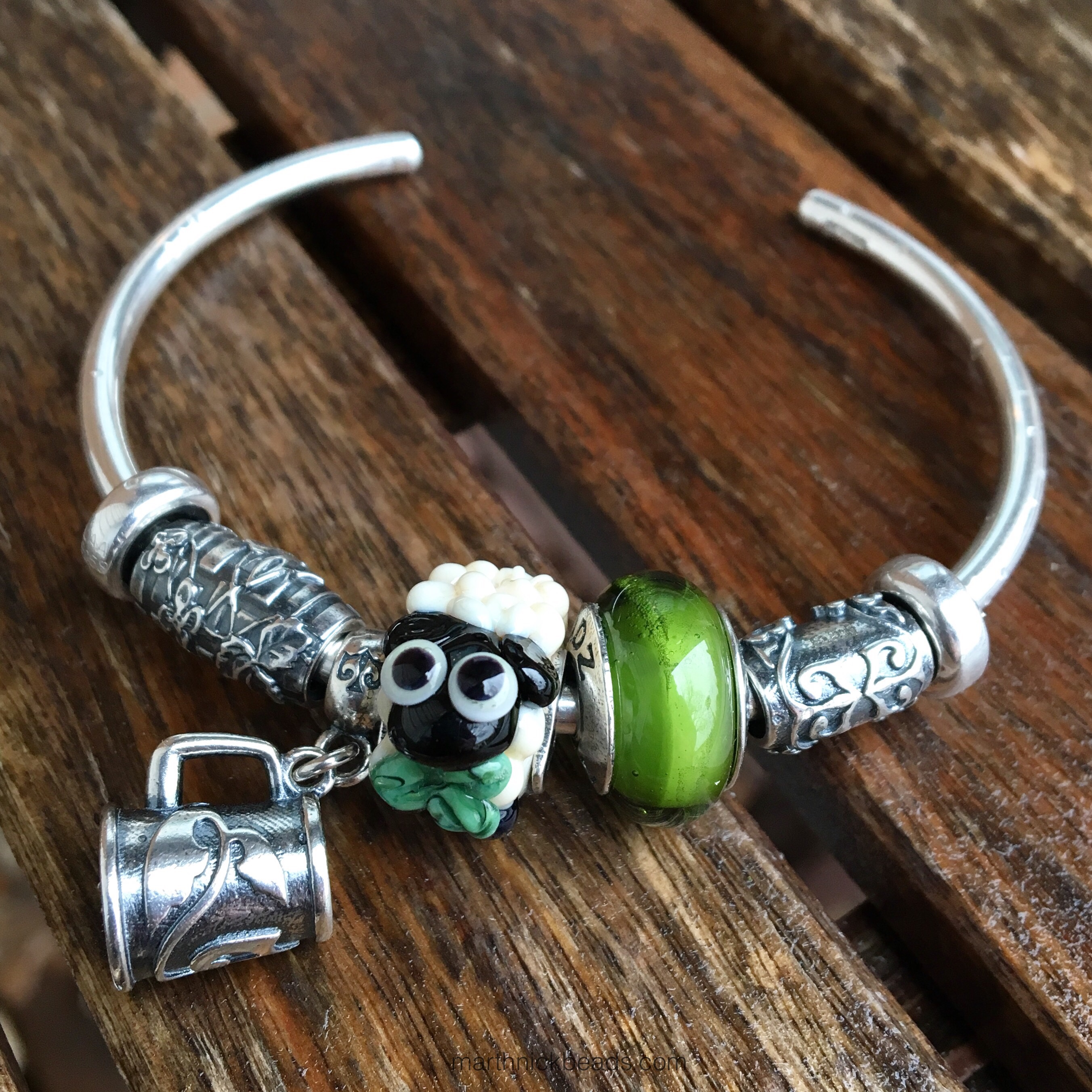 O’Sheep ($40 USD) and True Pint ($55 USD) make a fine pair on the Trollbeads Green Leather Bracelet. He’s supposed to be munching on the clover, but I do believe he’s also taking quite a few sips of something from the mug.