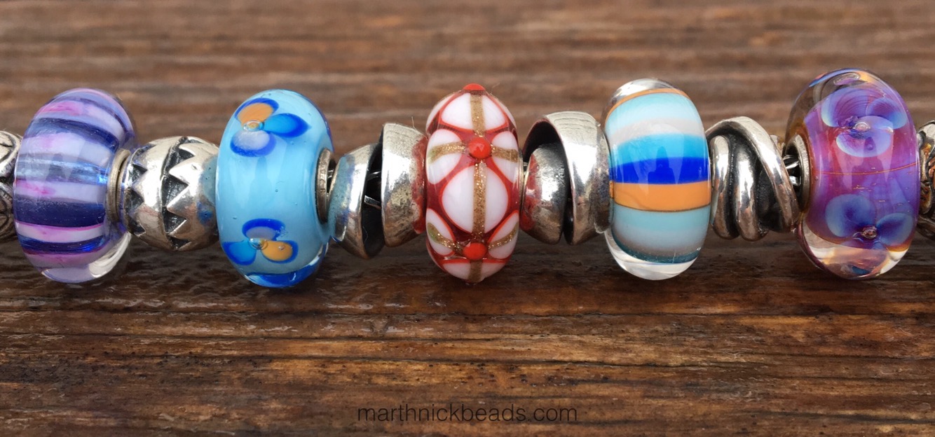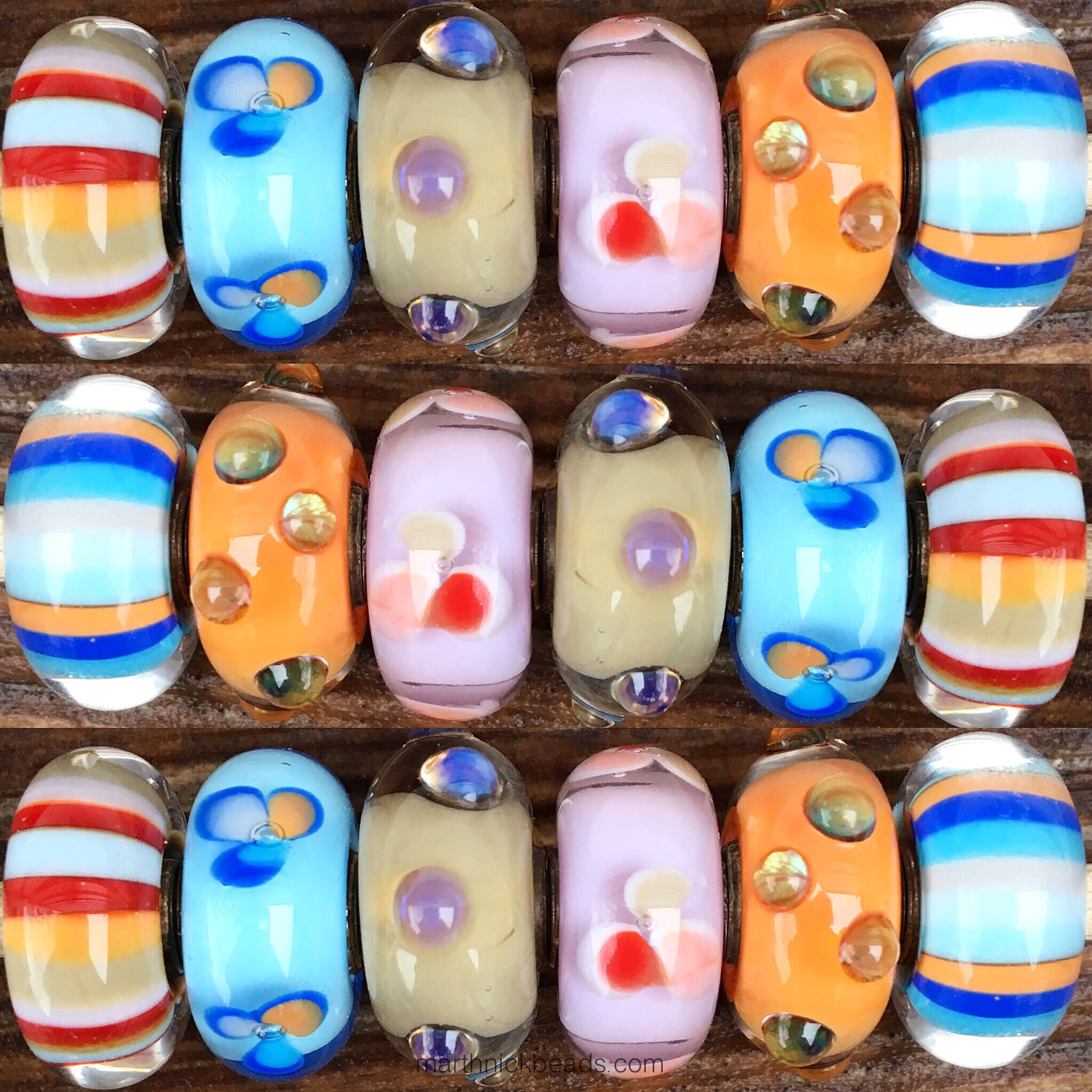 Below left to right are the Beehive Spacer, Strawberry Stripes, Quiet Flower Bead, Beige Moonstone, Feel Good Silver, Violet Stripe, Aztec and Blue Fantasy.