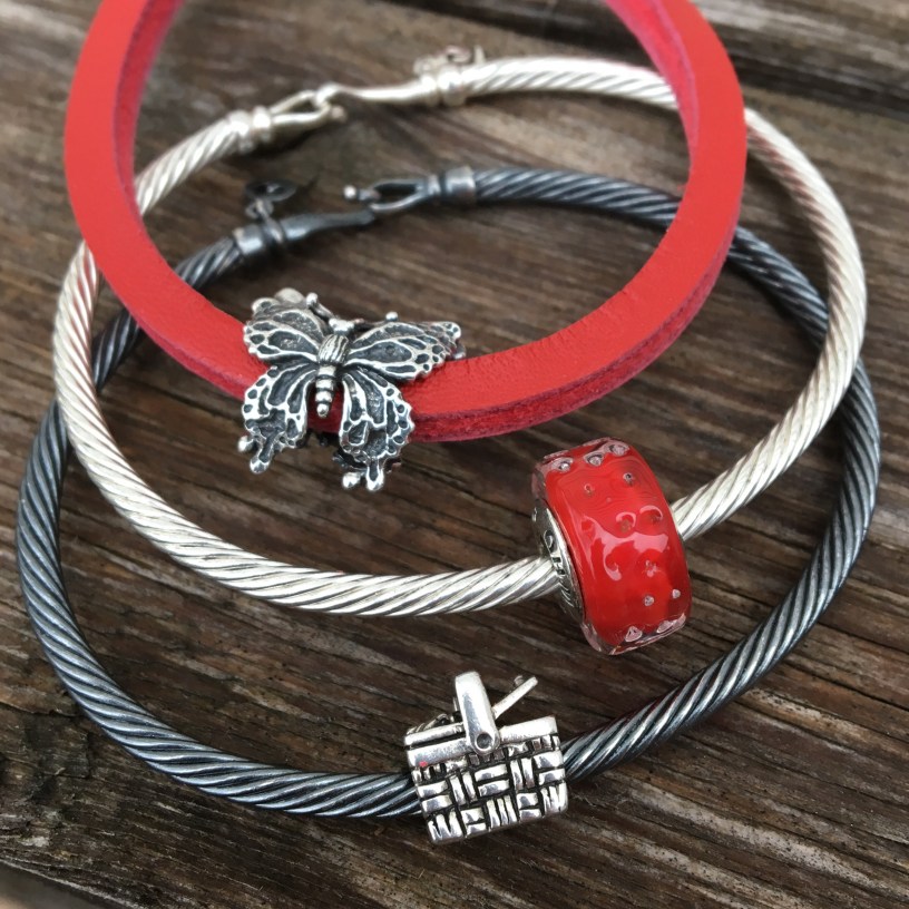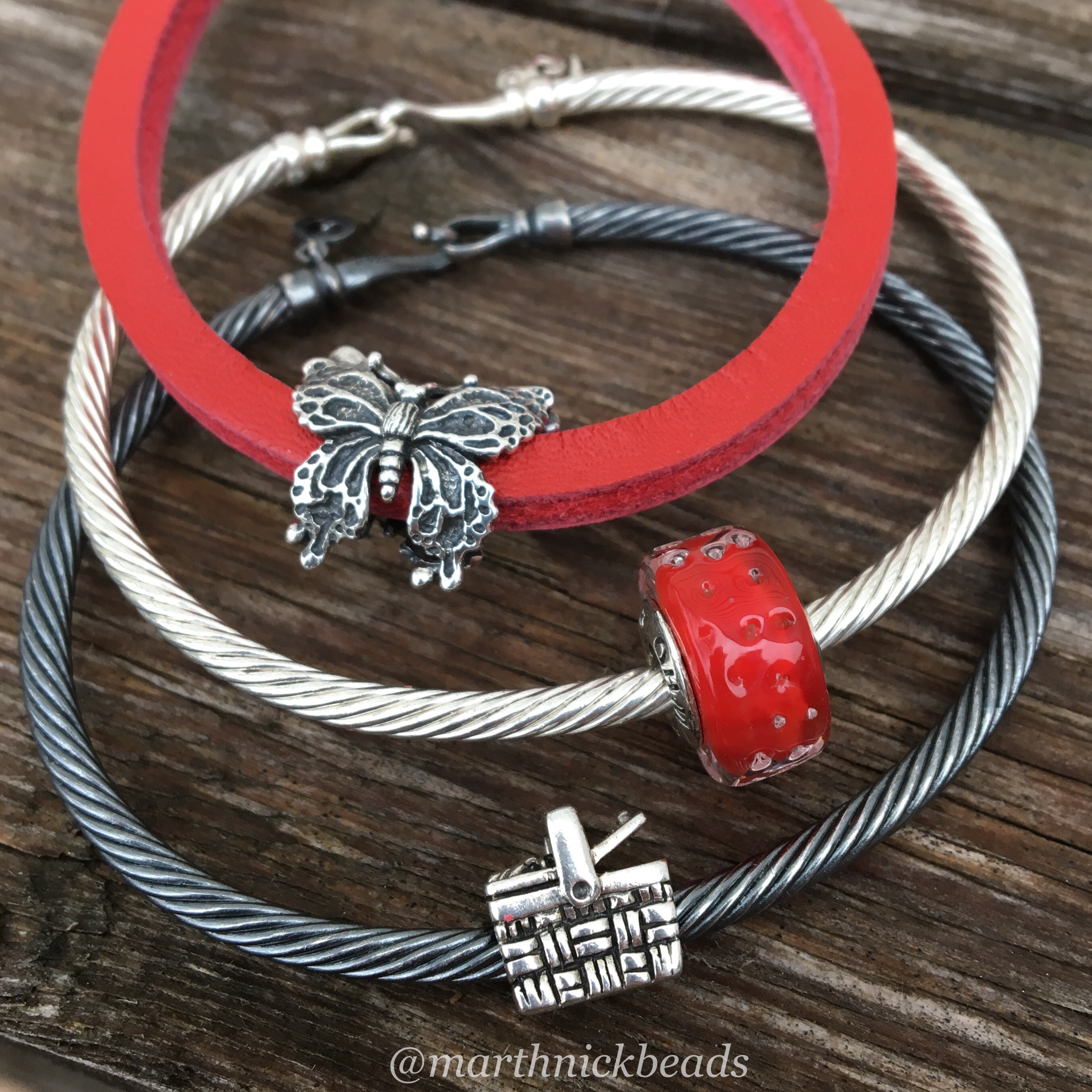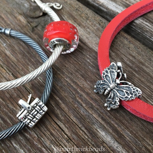 In the combos below, the Butterflies bead perfectly fits on a Trollbeads Unique Leather Bracelet. The red matches the Strawberry bead and the Picnic Basket really pops on the Dirty Twisted Bangle.