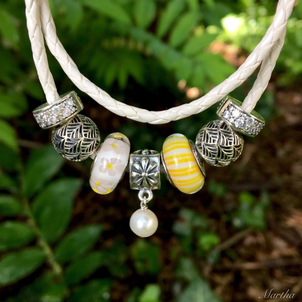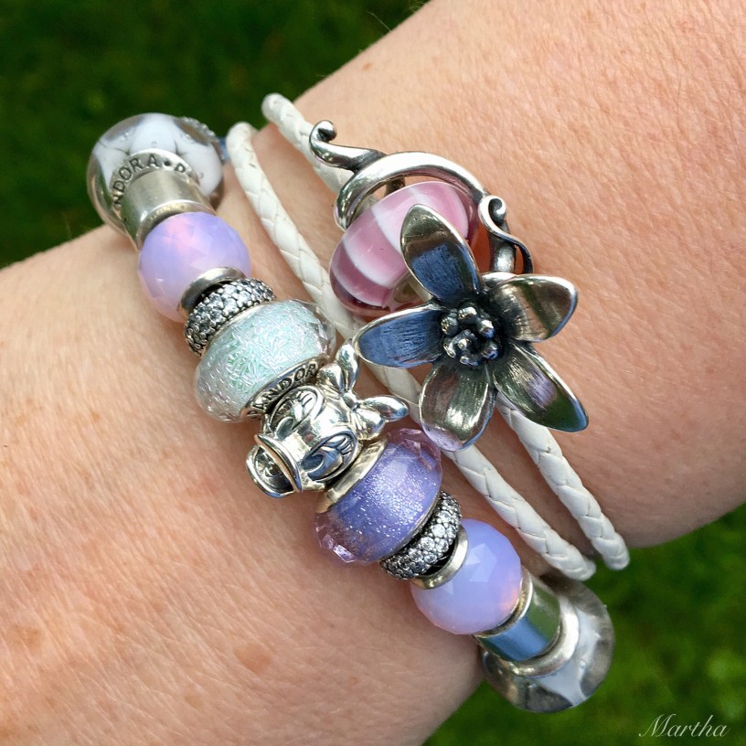 First I put some old (or shall we say, classic) Pandora charms on. Isn’t the dangle with the pearl so lovely? I should use it more often! I still really like those Tropicana silvers, too.