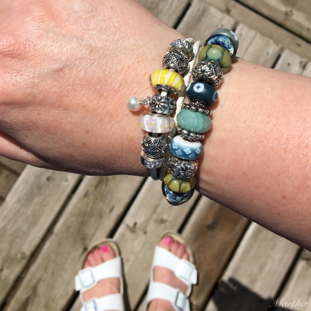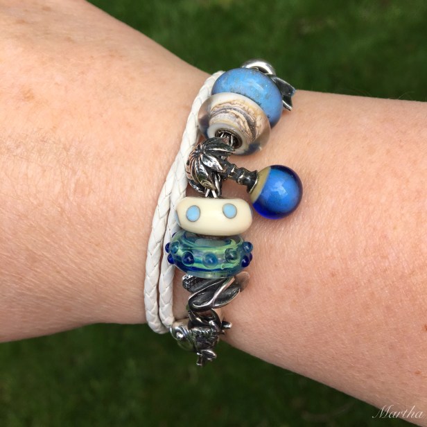 Lastly, for a summer vibe of let’s go to the beach here is a mini bracelet made with the Trollbeads Palm Island. Top to bottom are the Swim Fins, Beach, Cozy, Palm Island, Beige/Blue Dot, Whitecap, Flip Flops and the Fish Lock, all Trollbeads.