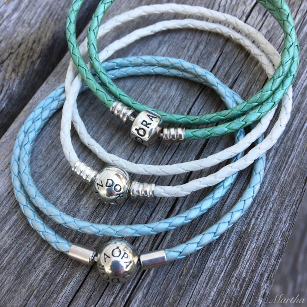 The other day I went to the mall to pick up the Pandora Ivory White Leather Bracelet. I was going to wait for the free leather bracelet event (in Canada) but then decided to focus on saving money for some gold Trollbeads stoppers. I love the look of the two tone blue and pink leather bracelets but decisions had to be made! I was interested to see that they have moved to the ball shaped clasp but with the threads. It doesn’t have that sheen that other recent leather bracelets have.